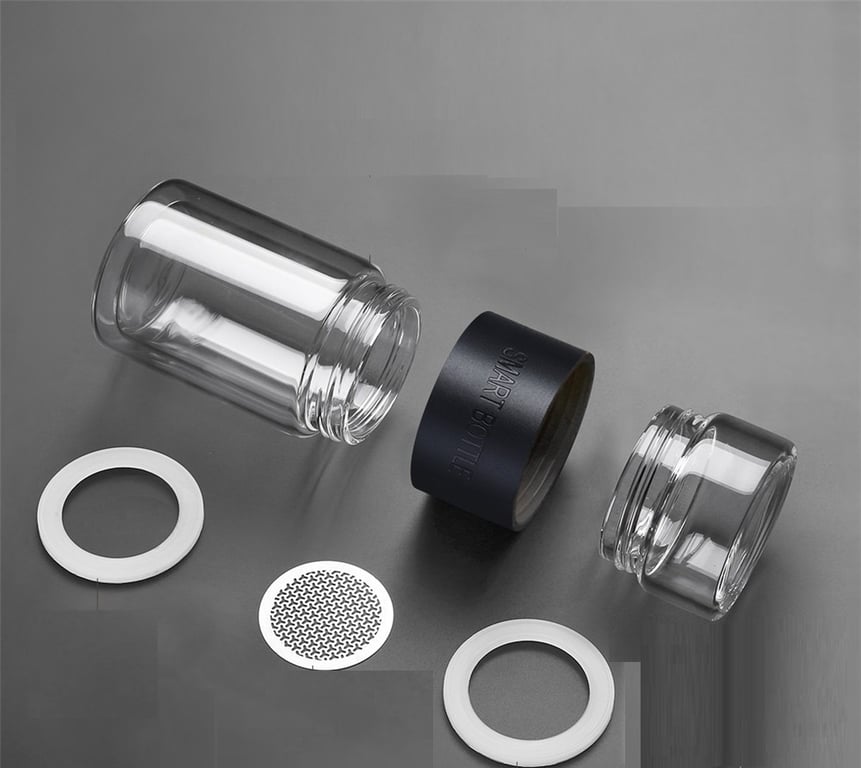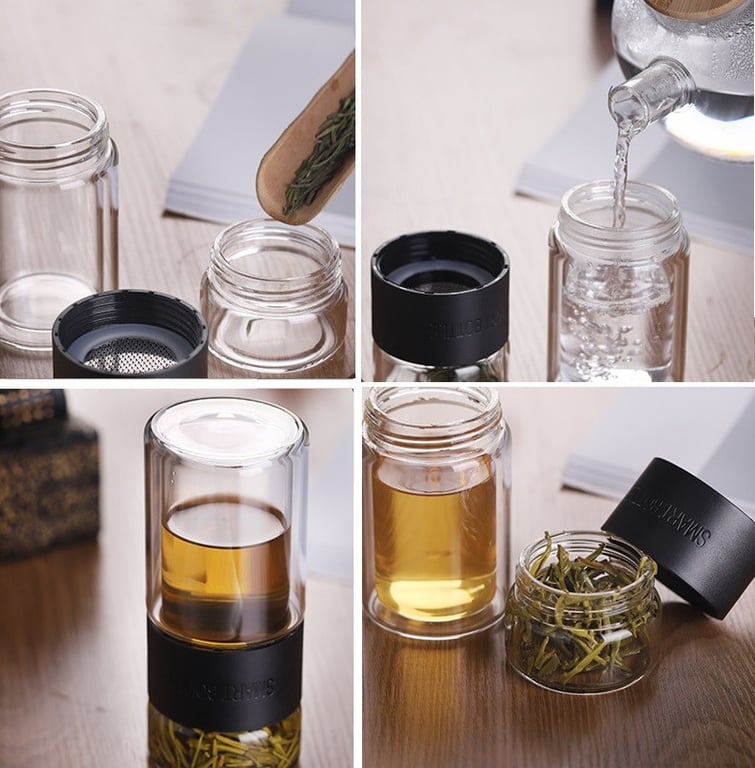 It consists of three parts - the main container, a middle dividing section with a filter, and a smaller container for tea leaves.