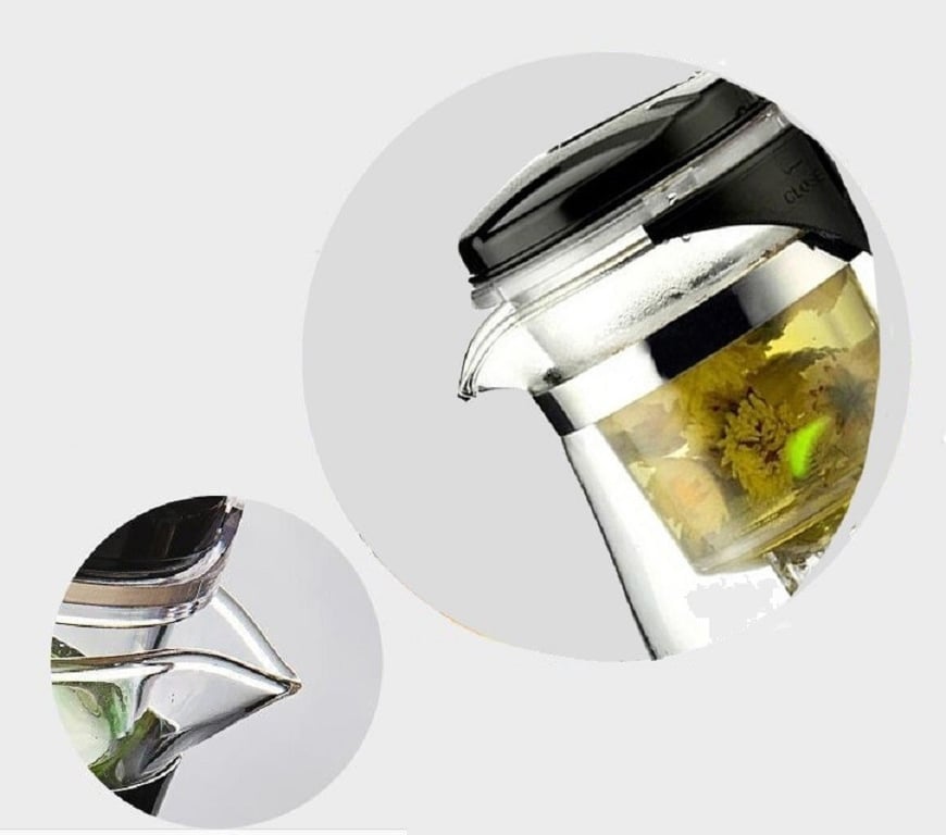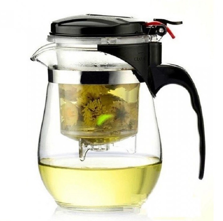 Kettle with a large filter for brewing tea.