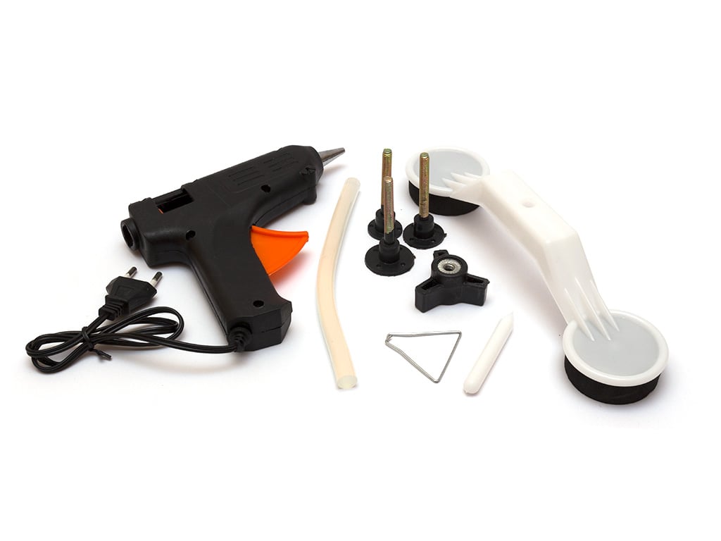 The package includes: a special lever with suction cups, a dent-pulling hammer, a glue gun, thermal glue 1x