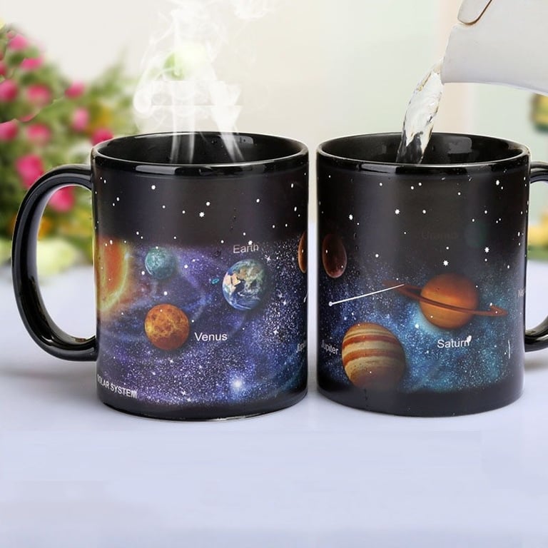 A mug with a space theme that changes colour when hot liquid is poured in.