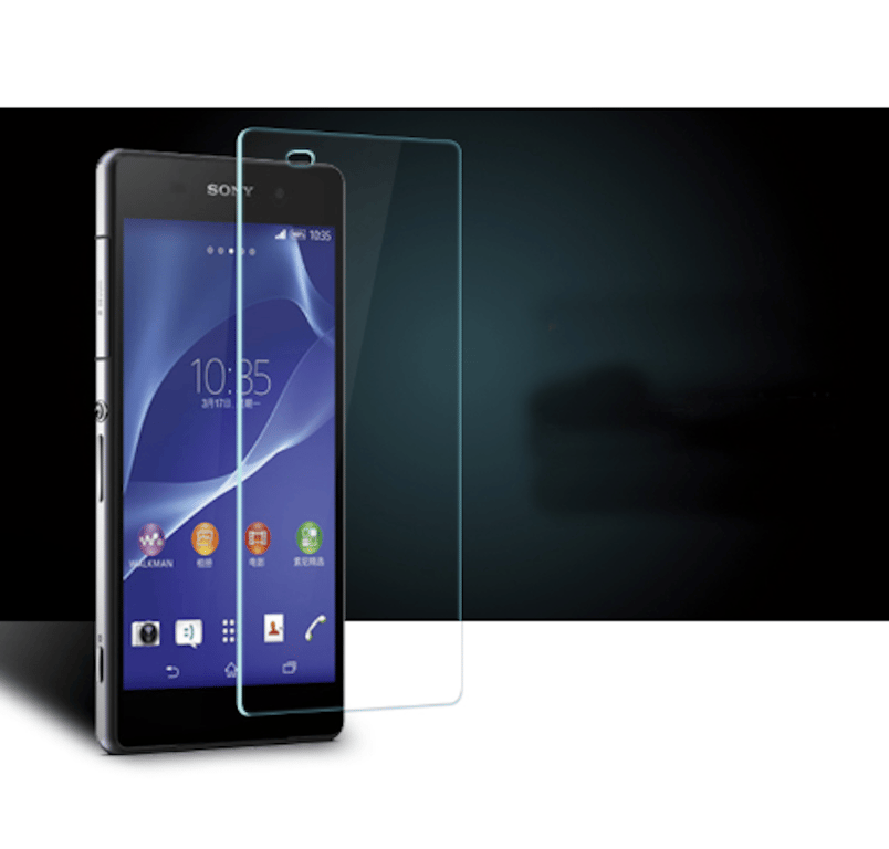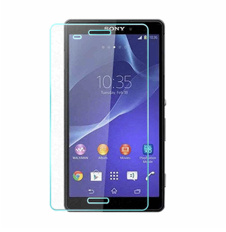 Tempered glass screen protector designed for Sony Xperia M2, Sony Xperia M4, and Sony Xperia M5 phone models.