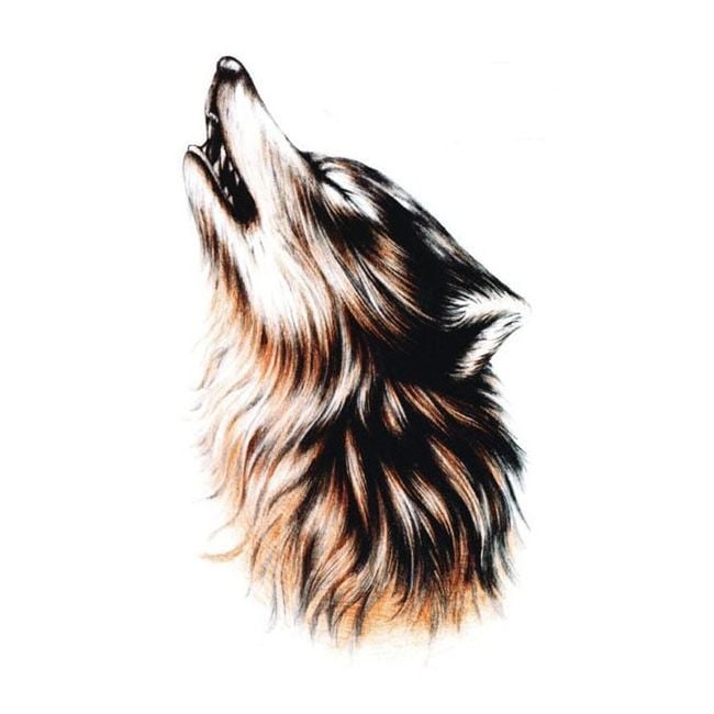 The tattoo is temporary and is designed for anyone who is afraid of needles or is simply unsure about the design. Apply using a damp sponge. The tattoo depicts a wolf.