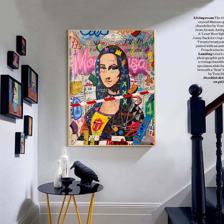 A stunning colourful painting featuring graffiti and the Mona Lisa, perfect for a modern interior. Available in two sizes.
