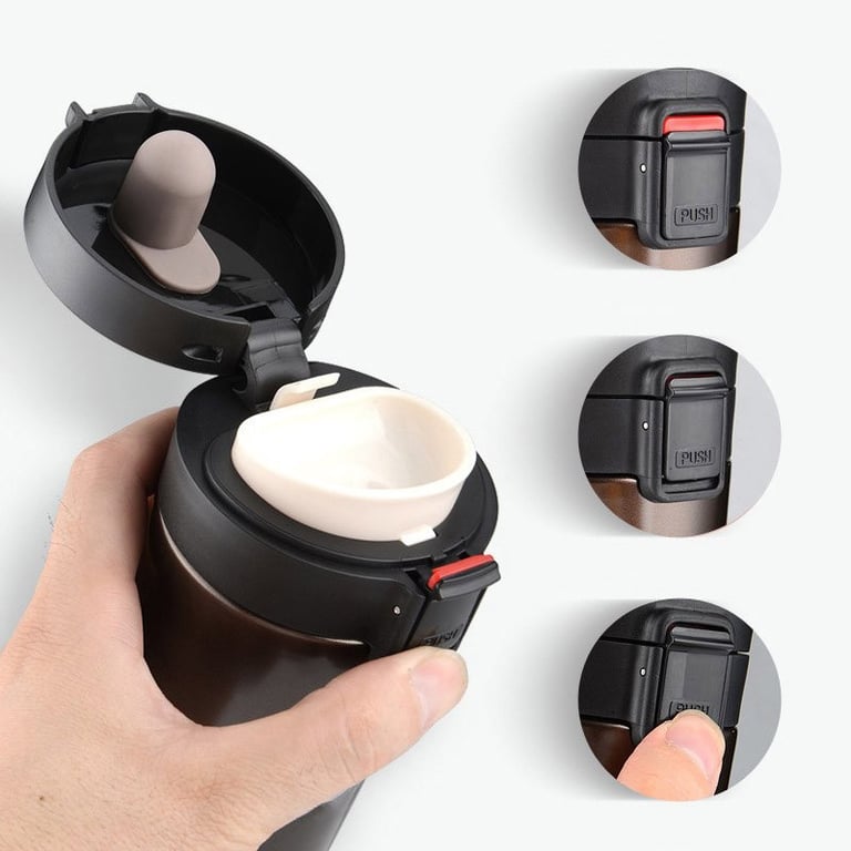 Travel thermal mug with a safety lid that prevents accidental opening. Available in two colour variants.