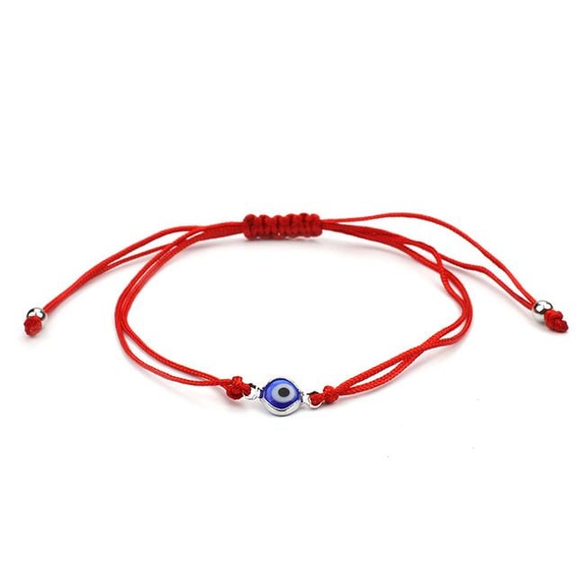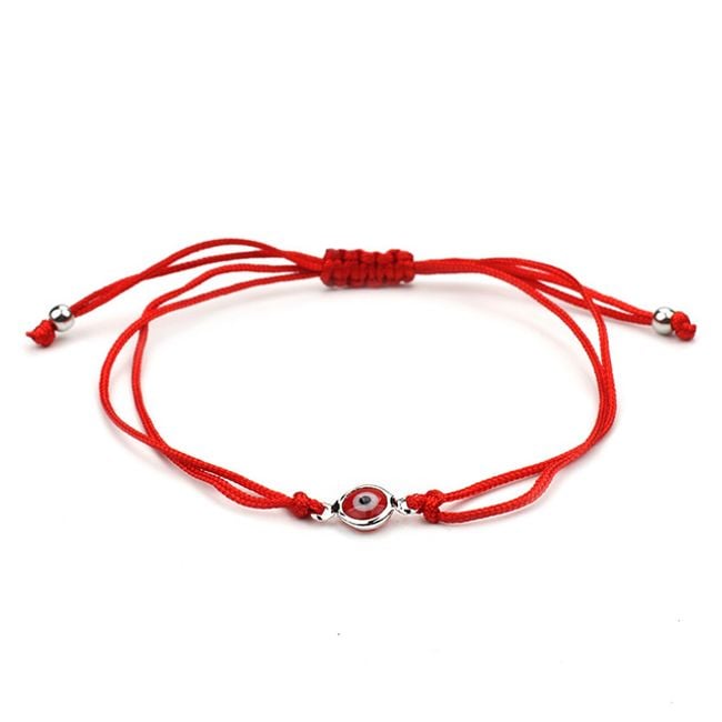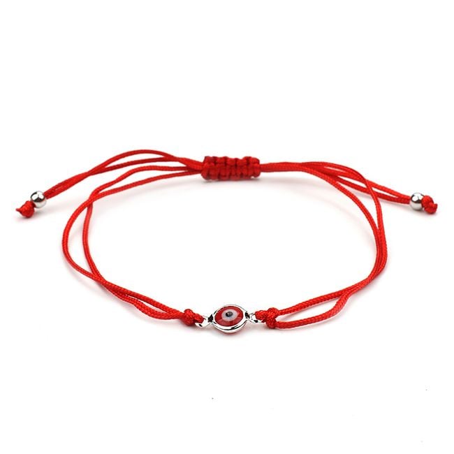 Favourite hamsa bracelet made of thin red string with an eye pendant. The bracelet is woven so that its length is fully adjustable using two loose ends. You can choose from two colour options for the eye (blue, red).