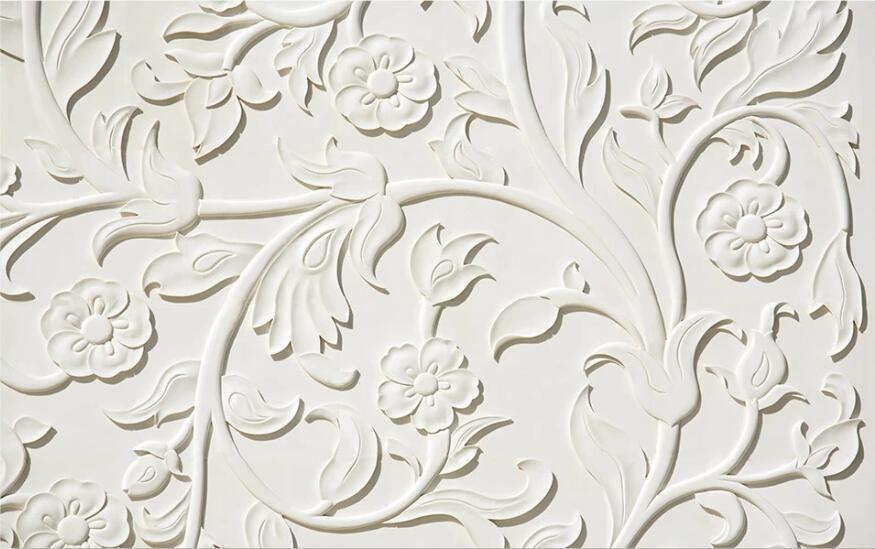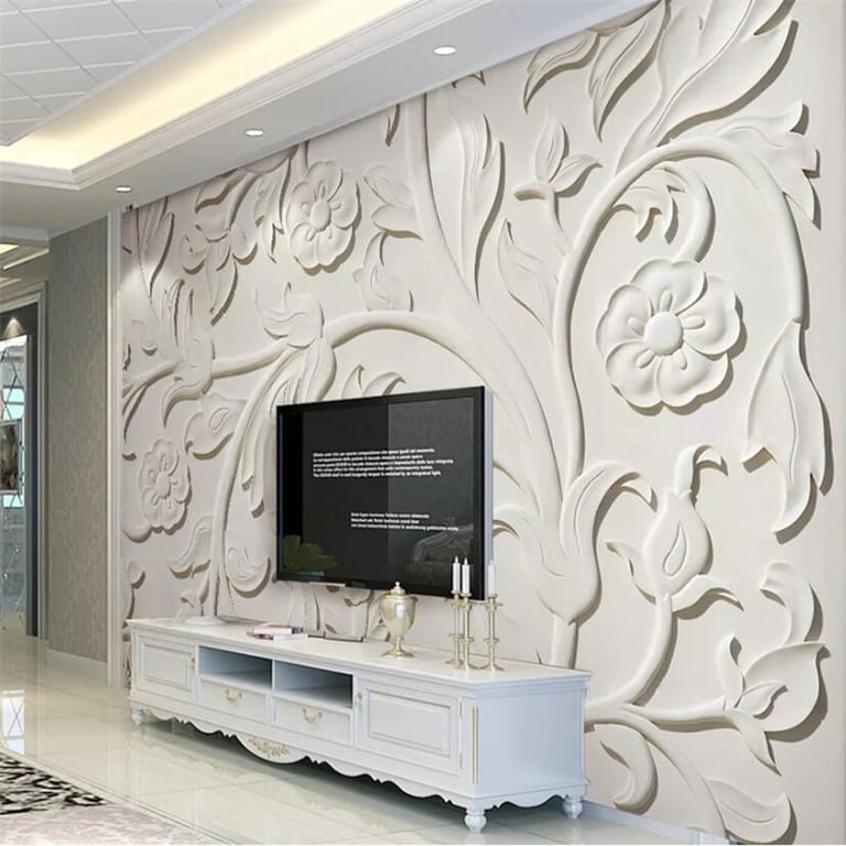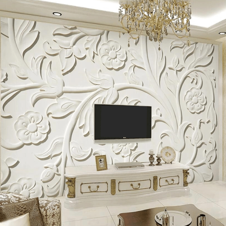 Three-dimensional wallpaper with a floral design.
