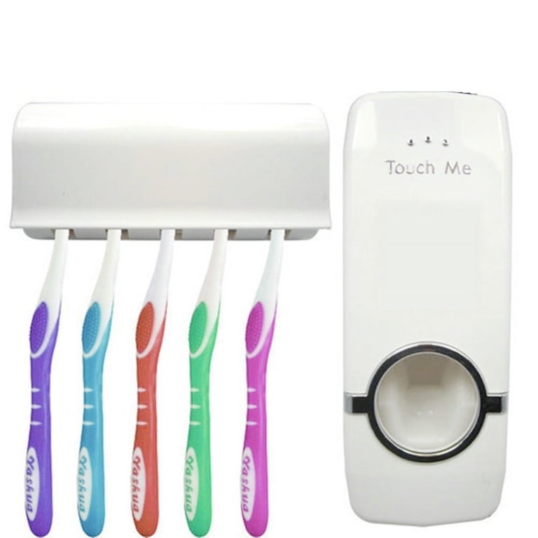 The holder has space for 5 toothbrushes. The dispenser automatically dispenses the toothpaste.