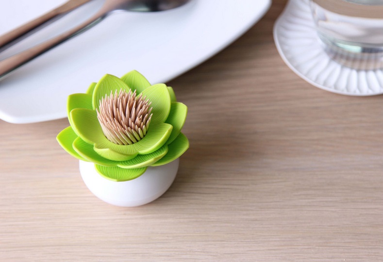 Plastic toothpick holder in the shape of a lotus flower.