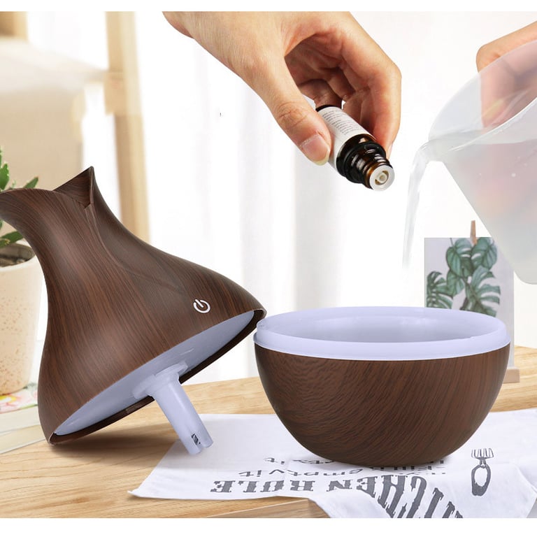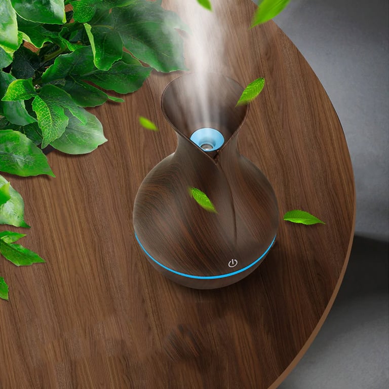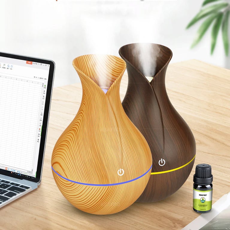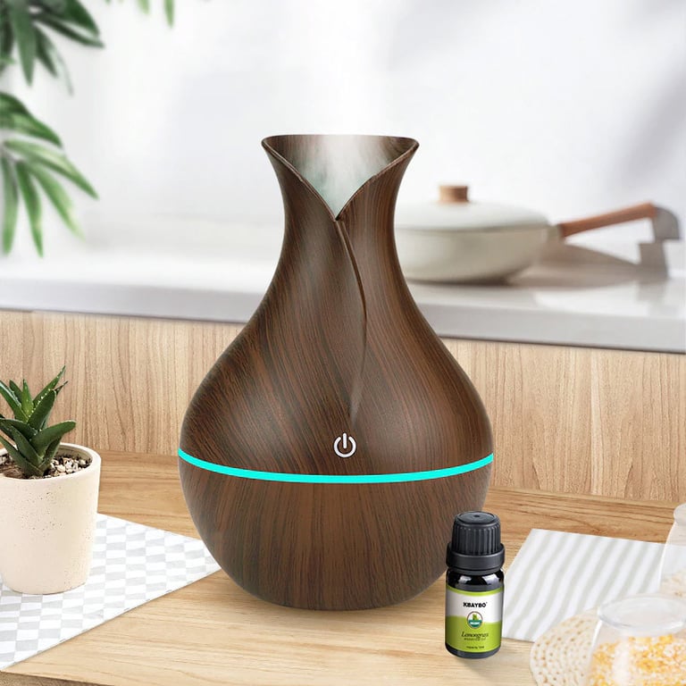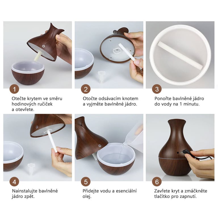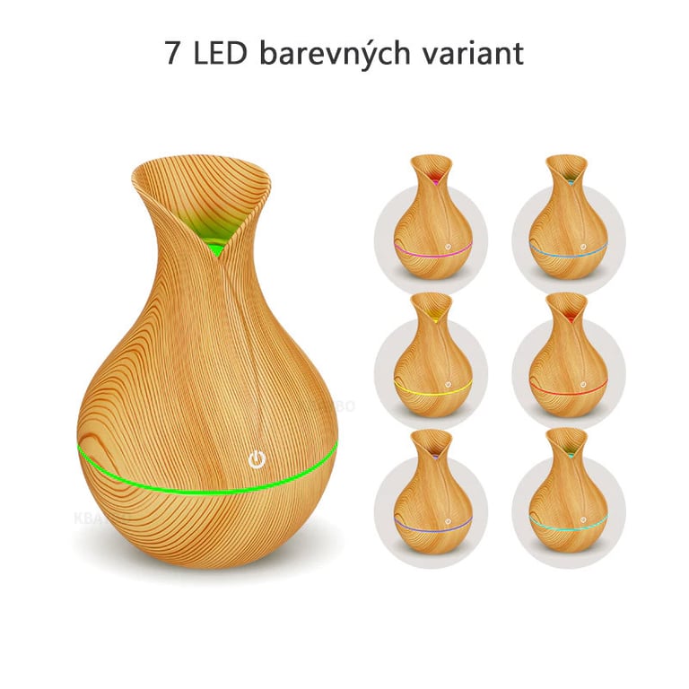 Aromatic air humidifier. Refreshes and scents your home. Just add water and one of the essential oils. Powered by USB cable. Lasts up to 6 hours. The diffuser also serves as LED lighting, changing through a total of 7 colours. Quiet. Pleasant appearance in a wooden finish. Available in two colours.
