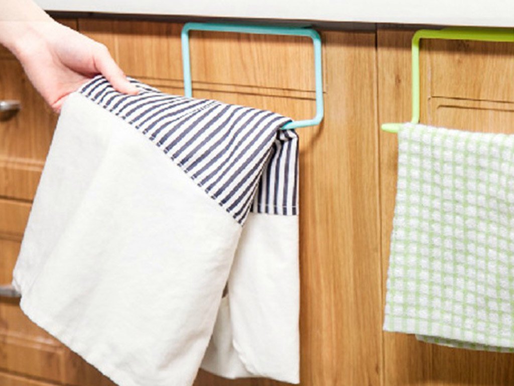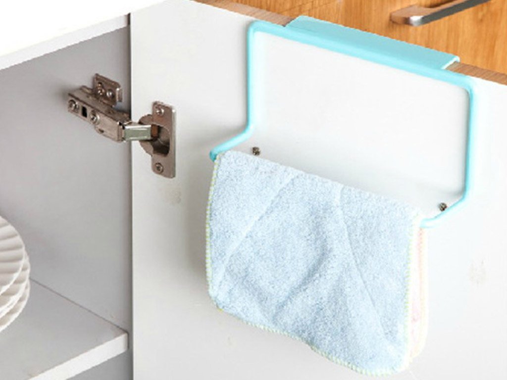 A practical gadget for hanging towels. The holder can be easily hung on the outside or inside of kitchen cabinet doors.