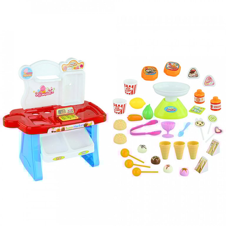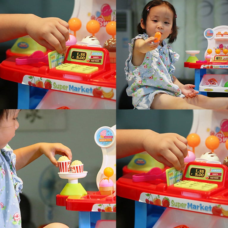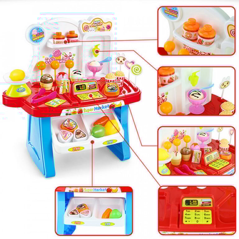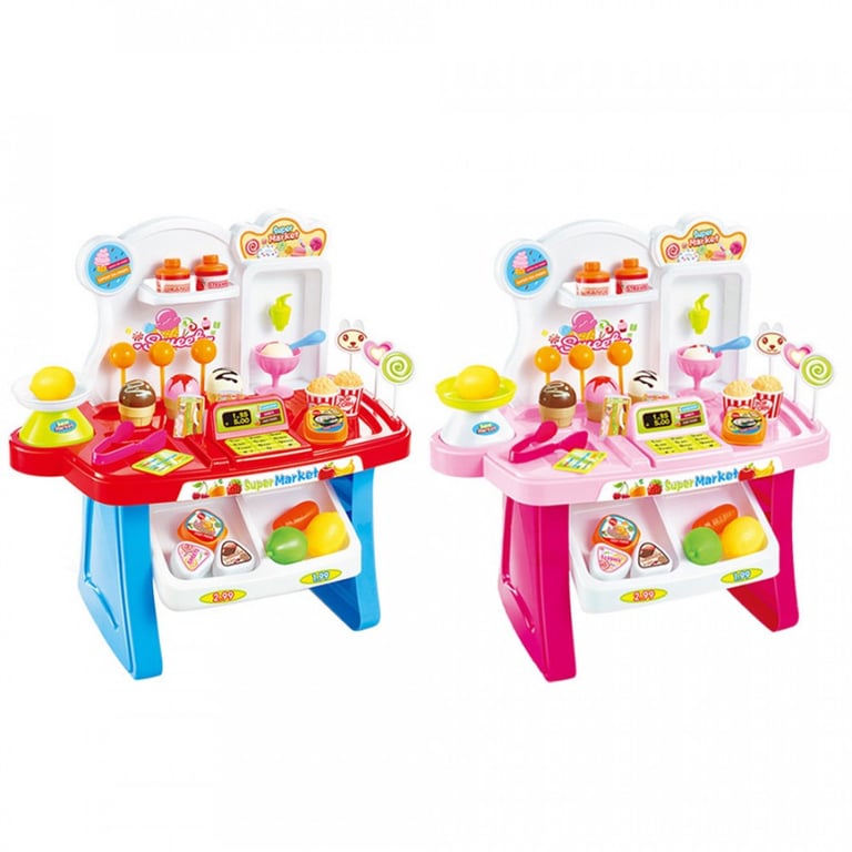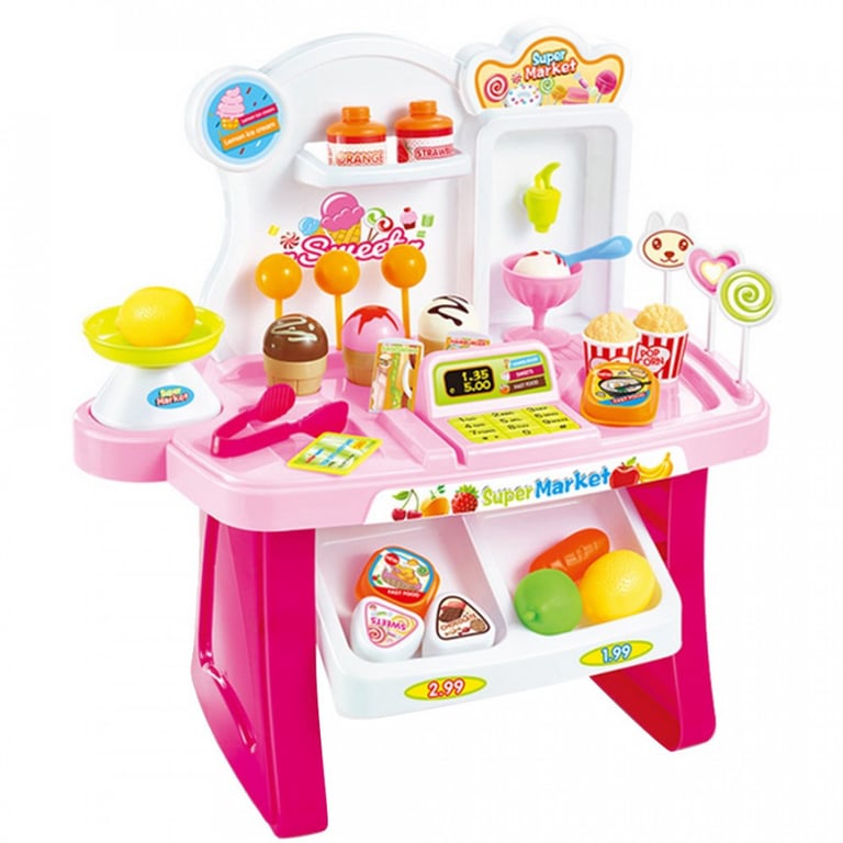 Miniature supermarket for little shopkeepers. Cash register with sound effects. The set includes a complete range of food from vegetables and fruits to desserts. Available in two colour variants – blue and pink.