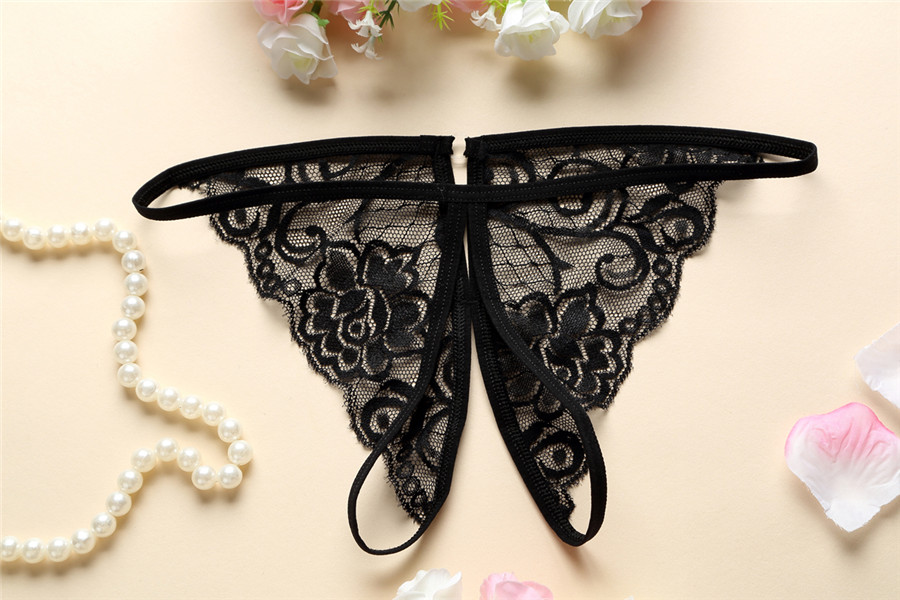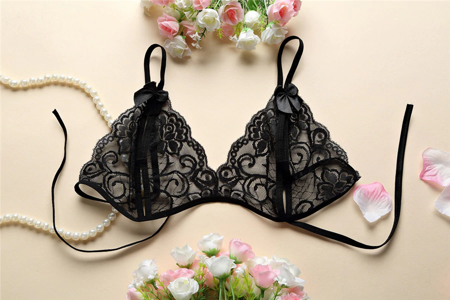 Lace erotic lingerie set, which includes a sheer bra and panties with openings.