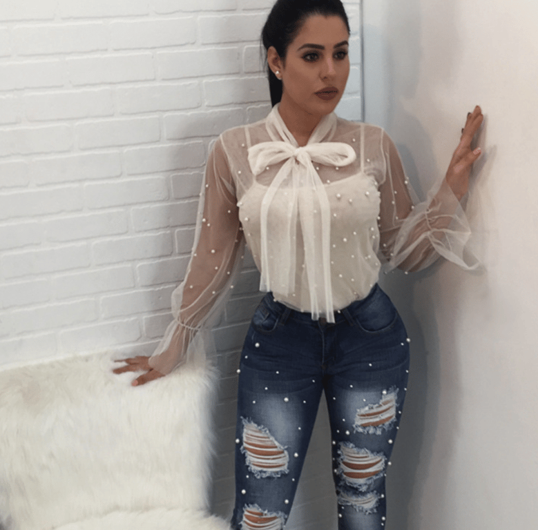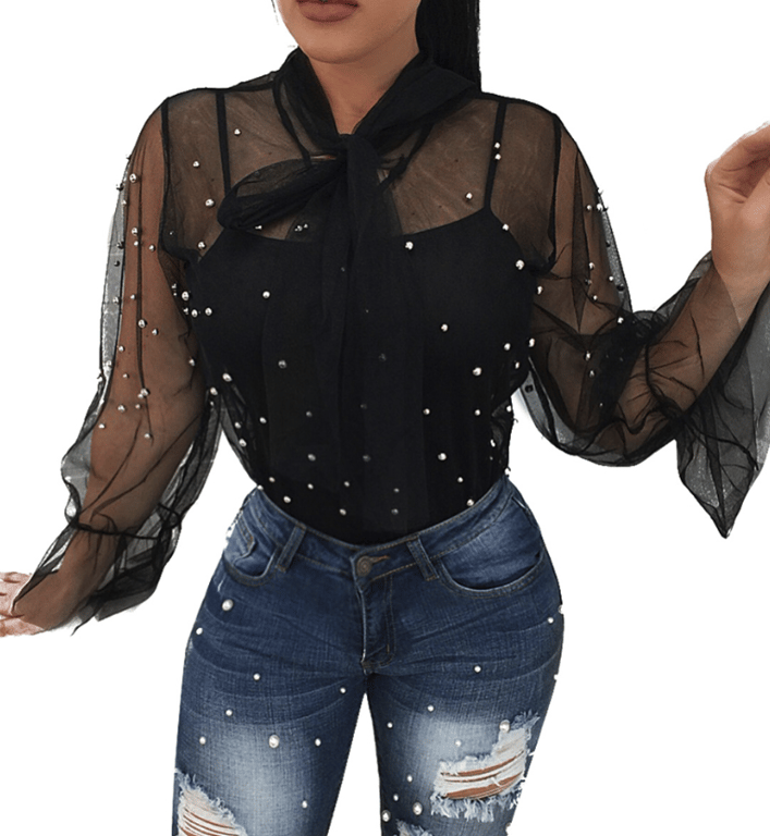 Transparent mesh airy women's blouse with pearls
