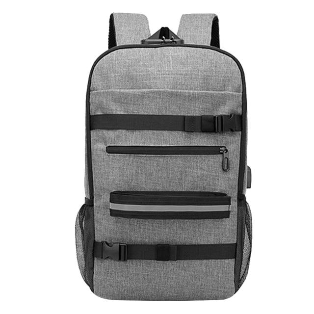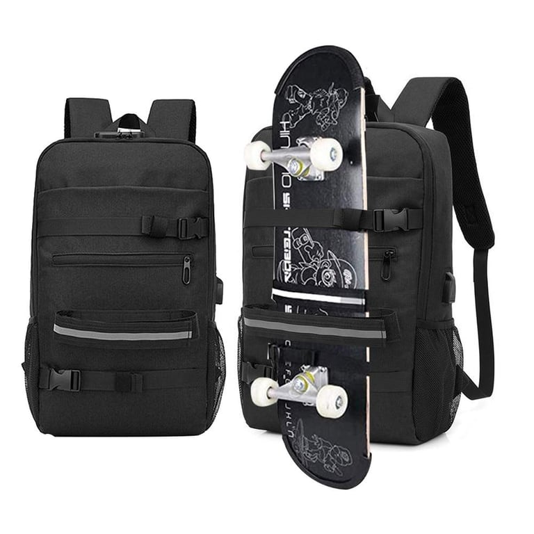 Ergonomic skateboard backpack with reflective stripes, built-in USB charging port, lock, and storage space for a laptop or textbooks.