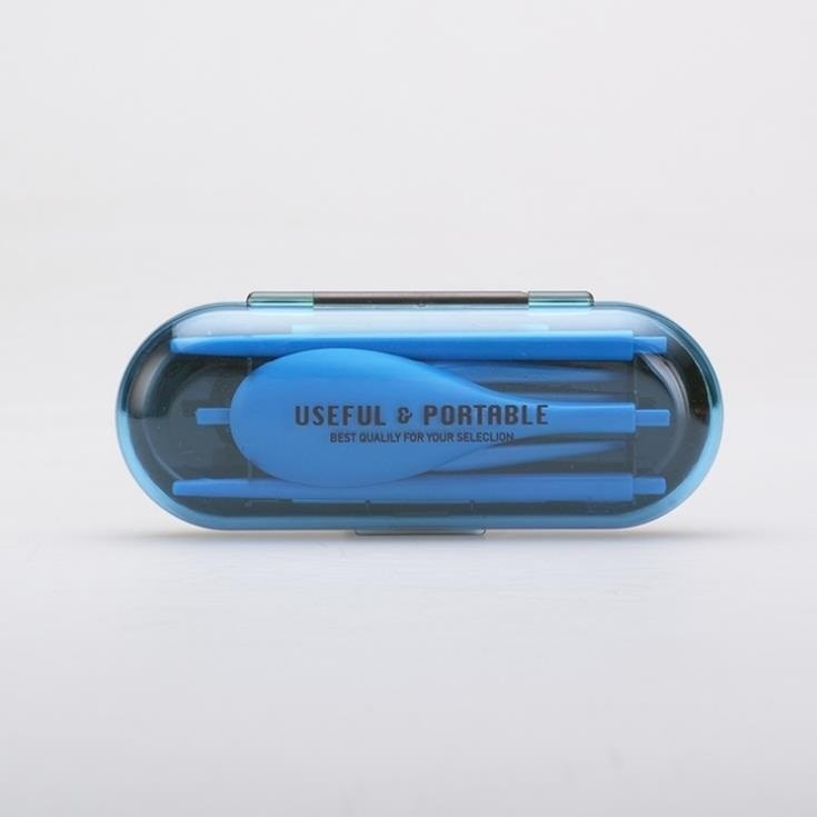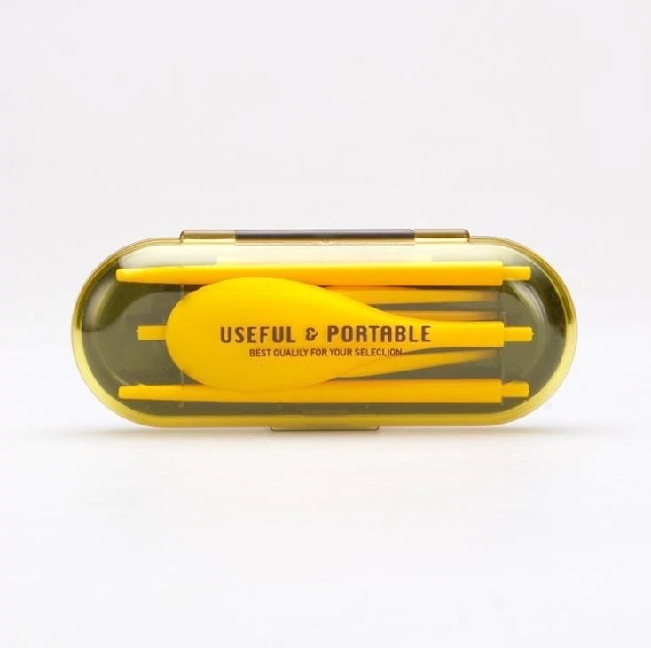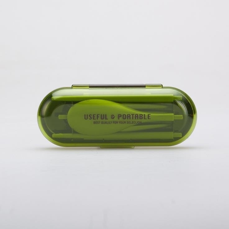 This folding set includes a spoon and a fork. The set is stored in a small case, which is very compact.
