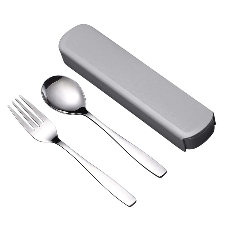 The set includes a stainless steel spoon with a fork and a case.
