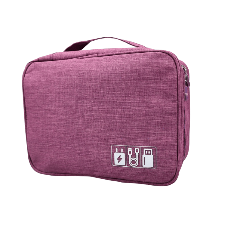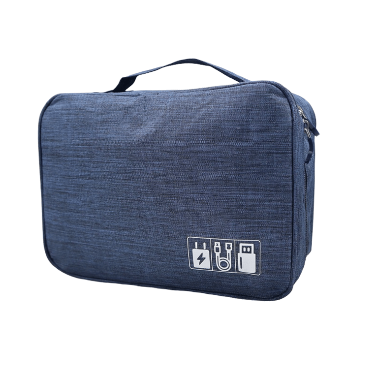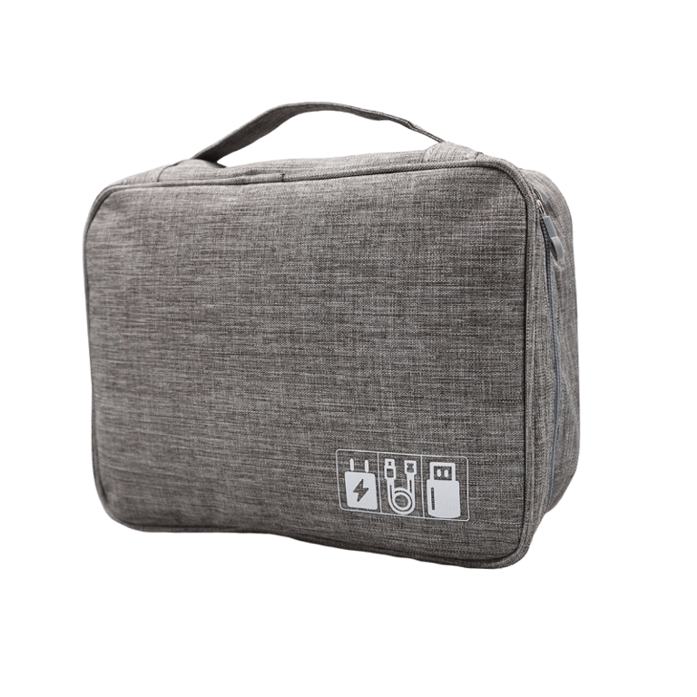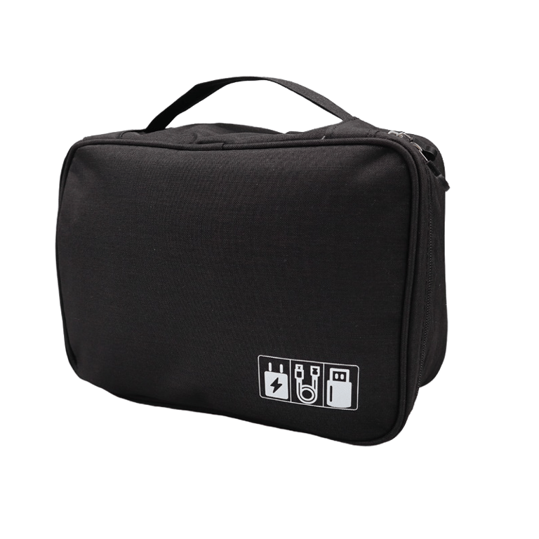 A practical organiser for cables and other electronics. It has 4 compartments and elastic loops in the lid for securing cables. The organiser zips closed. Equipped with a handle for easy carrying.