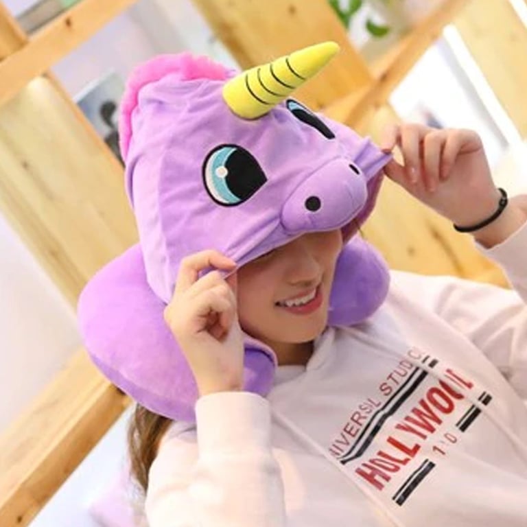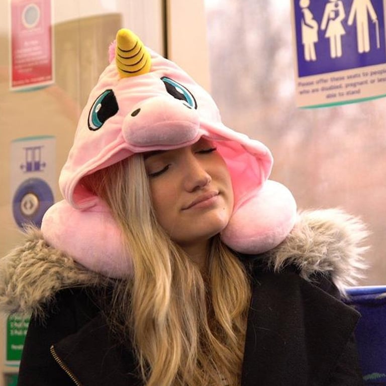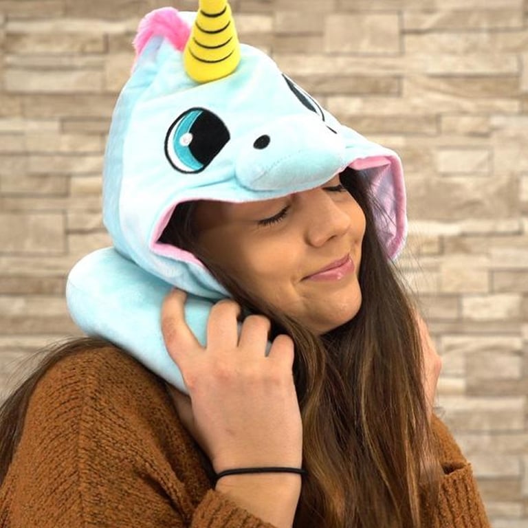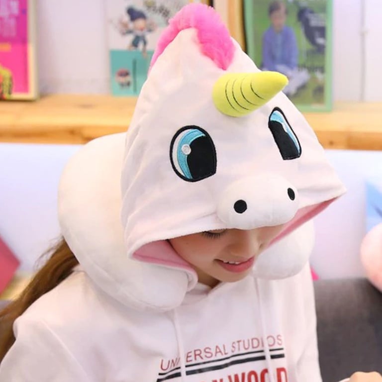 Cheerful travel pillow with a unicorn design on the hood. Choose the right colour for you from the pleasant options available.