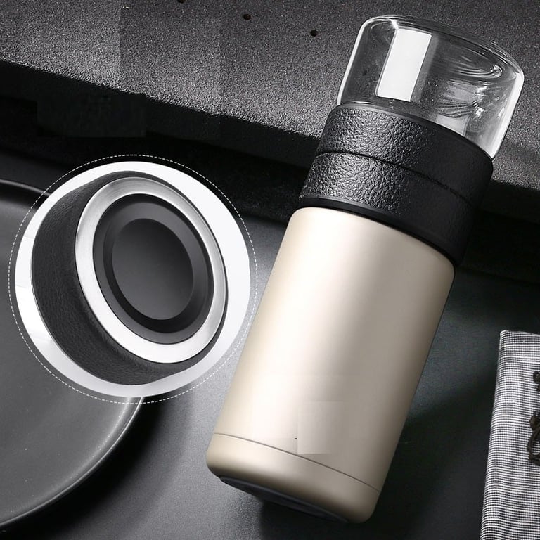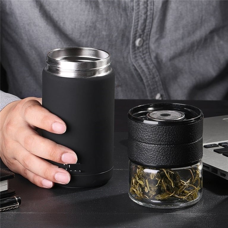 It has a main compartment for water, a middle section with a filter, and a smaller container at the top for tea leaves.