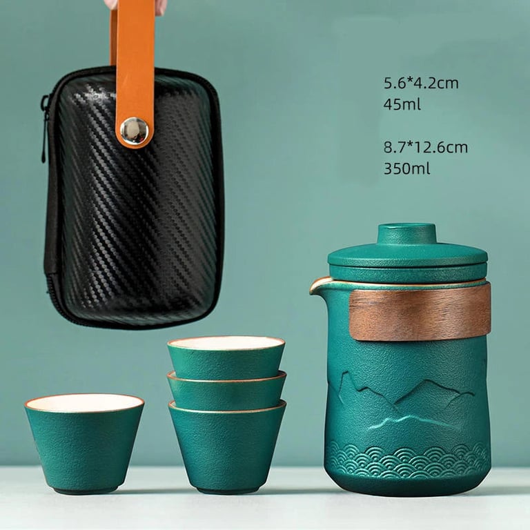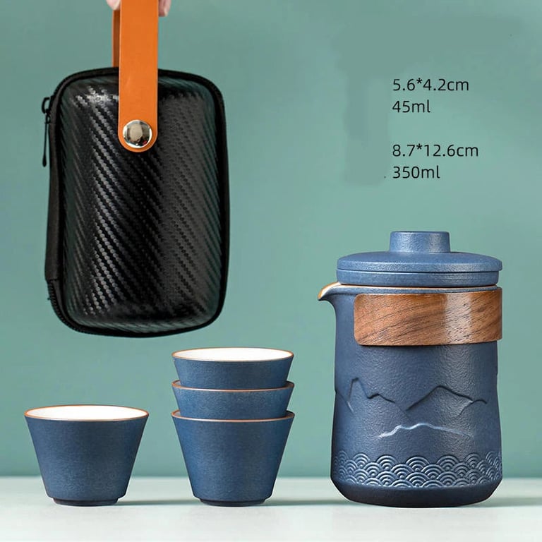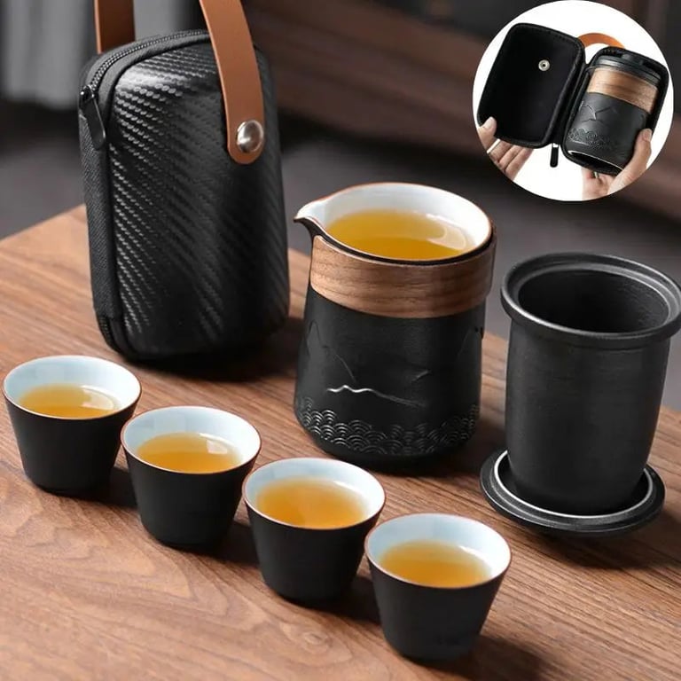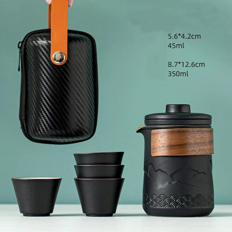 Elegant travel tea set in matte ceramic with a wooden detail. It includes a teapot with a built-in infuser, four cups and a sturdy case with a carrying handle for travel. Suitable for weekends away from home, to the office and for hiking.