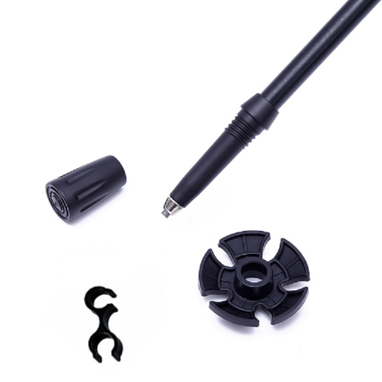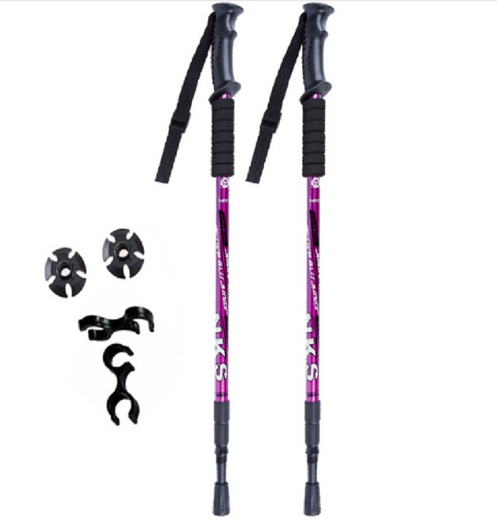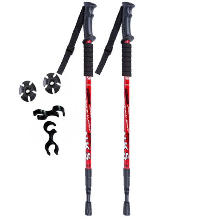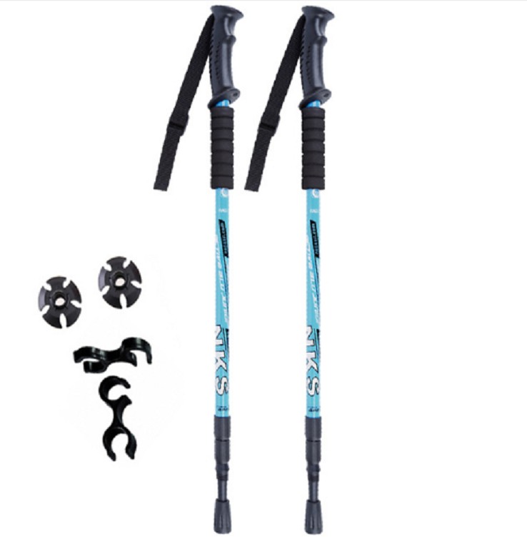 Trekking telescopic poles with an anti-shock system providing support while walking, absorbing impacts, offering balance, and protecting joints during long hikes.
