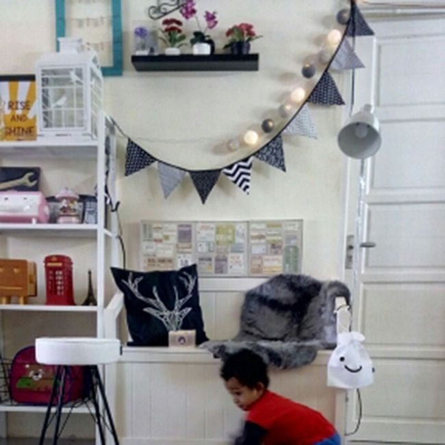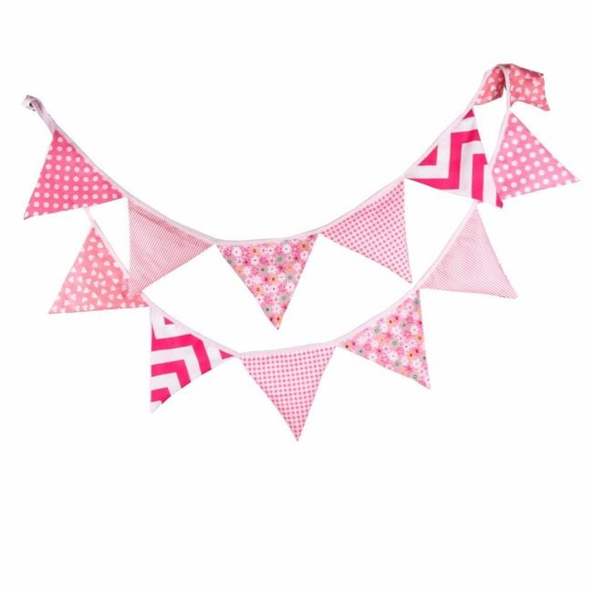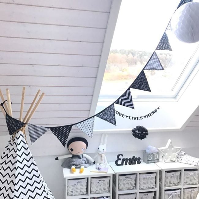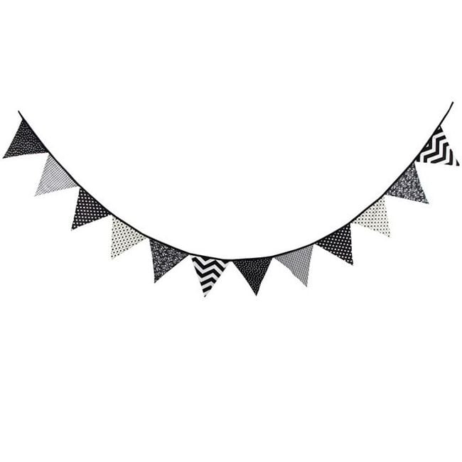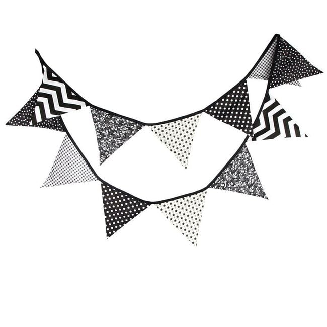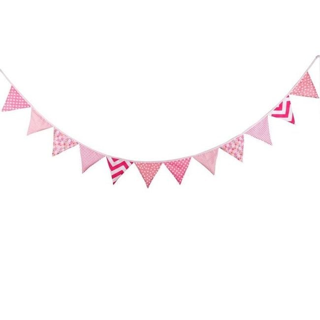 The garland measures just over three metres in total and is decorated with triangles in various designs. It is suitable as a decoration for a children's room or for celebrations.