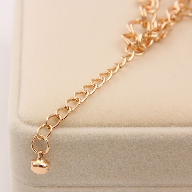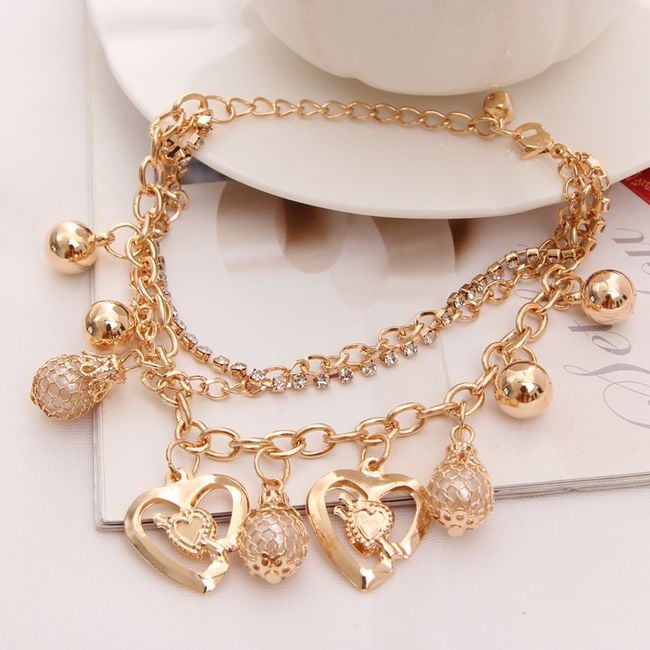 The triple bracelet is adorned with a variety of charms – hearts, beads, and drops.