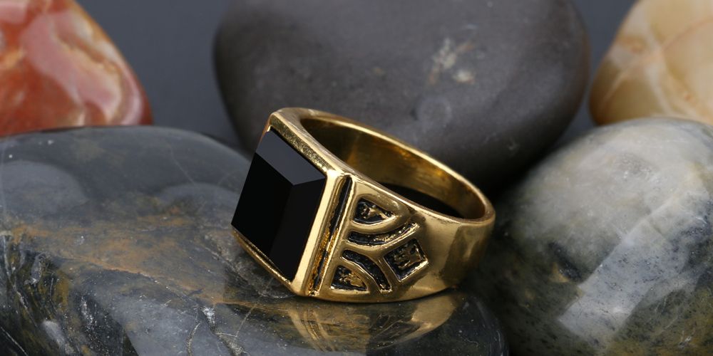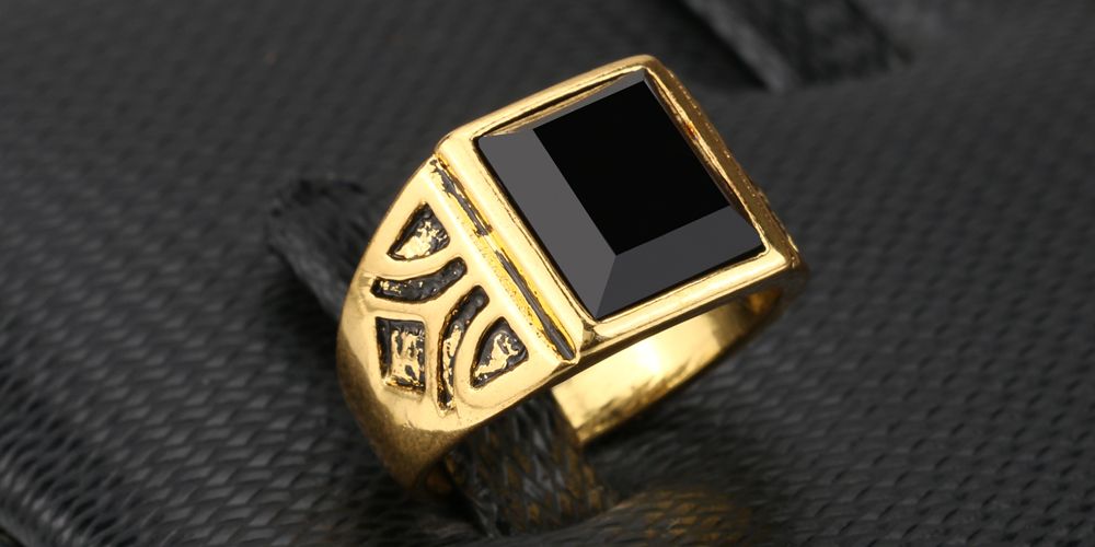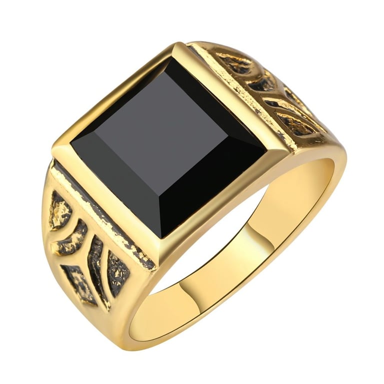 Men's gold-plated ring with a black stone