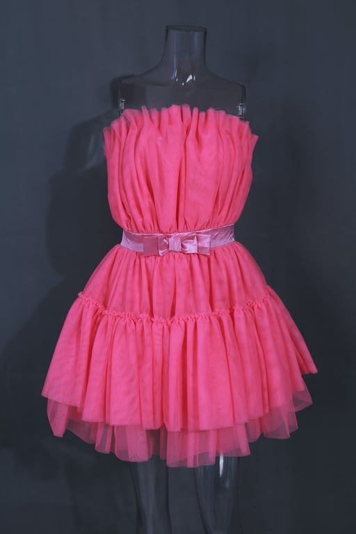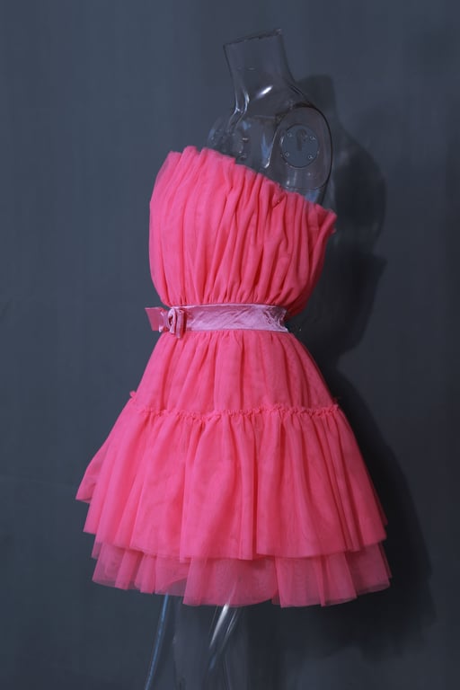 Women's strapless tulle mini dress with a layered skirt.
