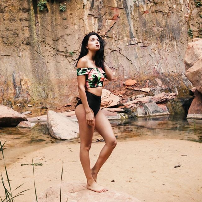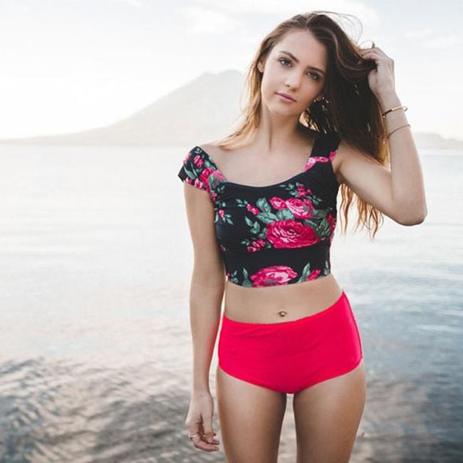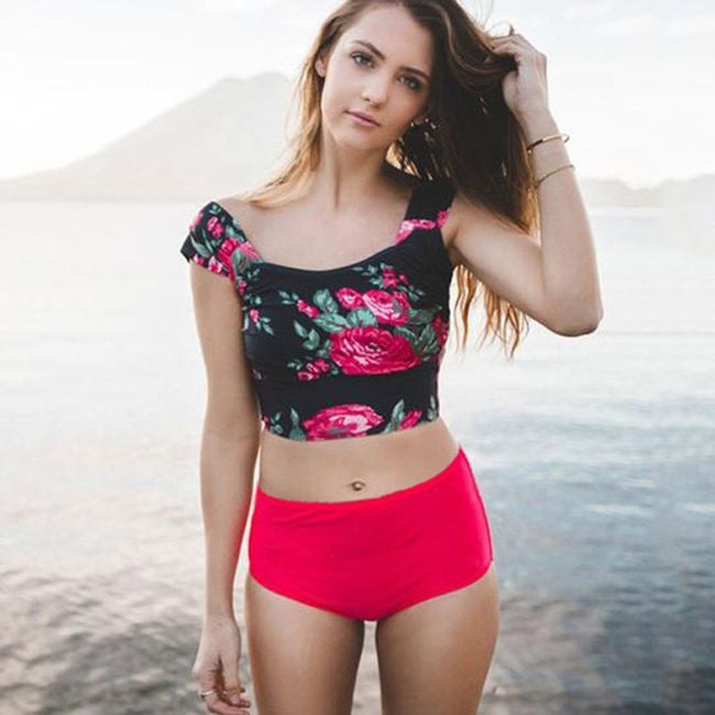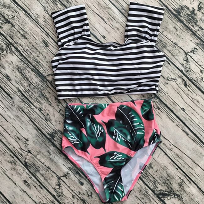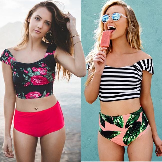 Women's two-piece swimsuit with a high waist and off-shoulder straps is adorned with an exotic pattern. Available in 3 colour variants.