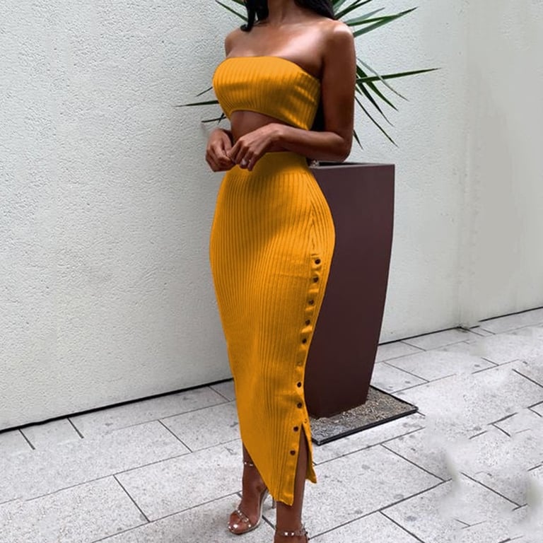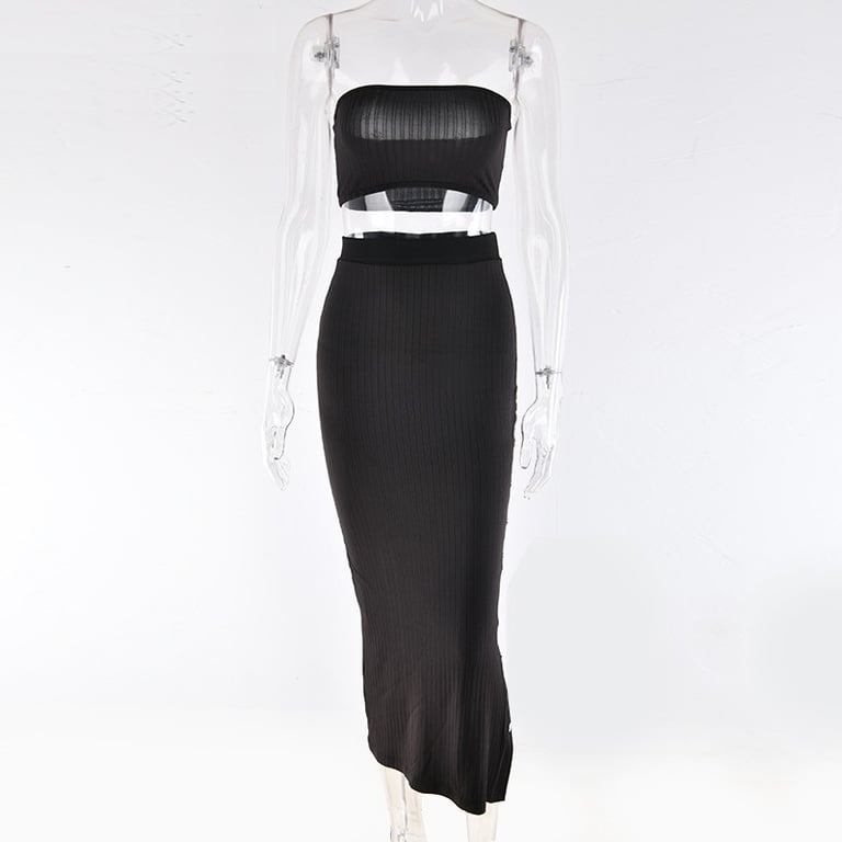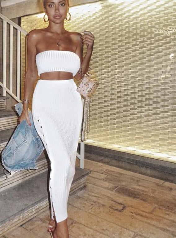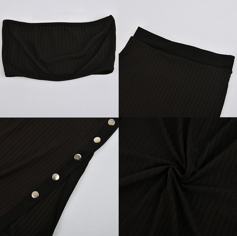Composed of a strapless top and a skirt adorned with studs.
