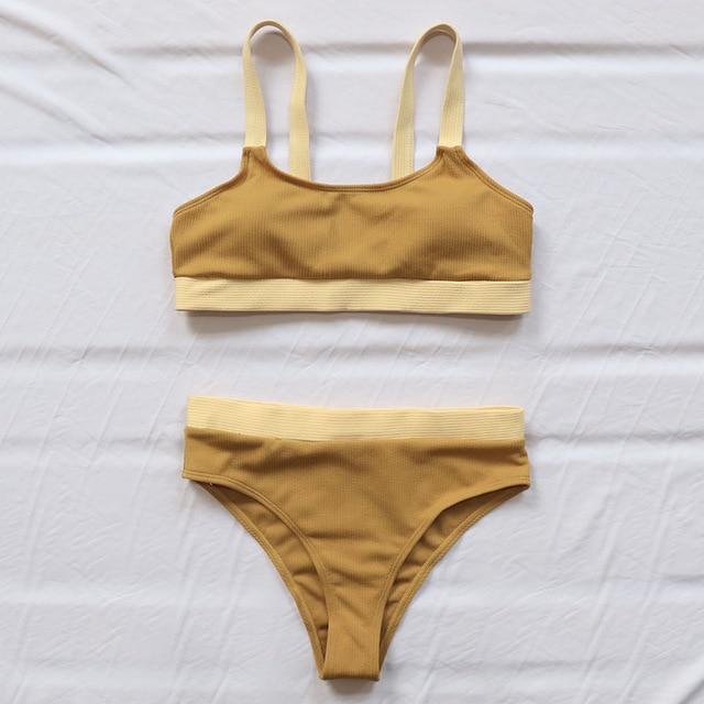 Two-piece sexy coloured bikinis for women. Several different colours are available. The swimwear is made from spandex and polyester.