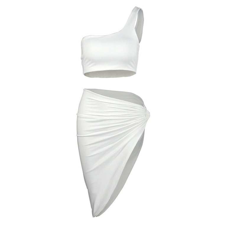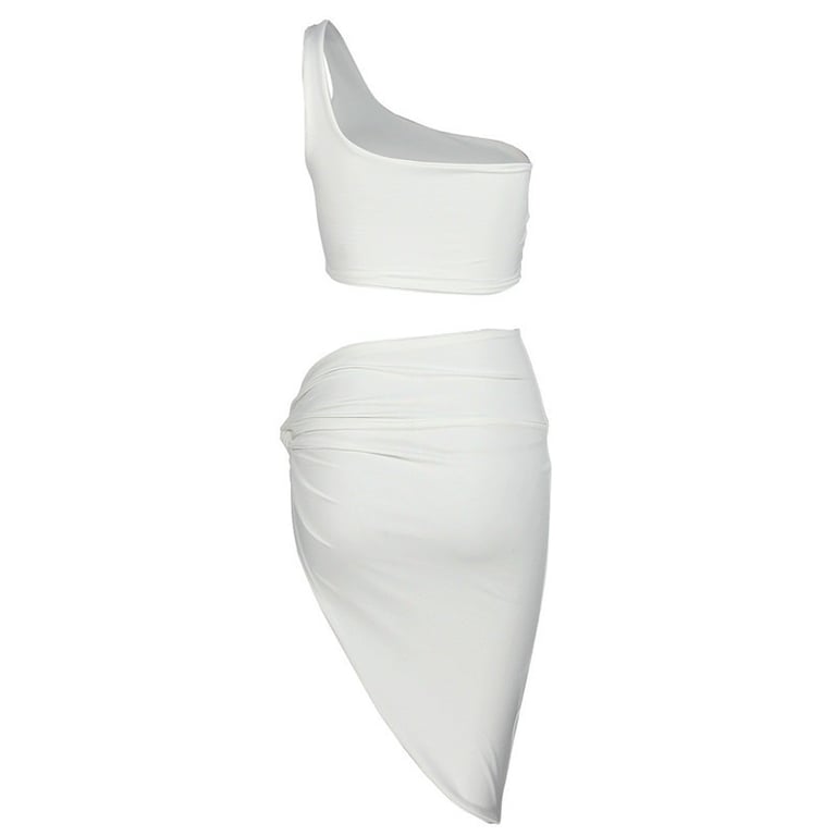 One-shoulder top, skirt with a high slit.
