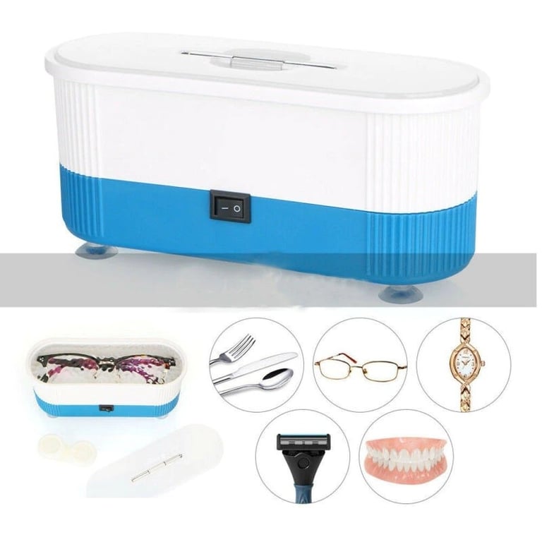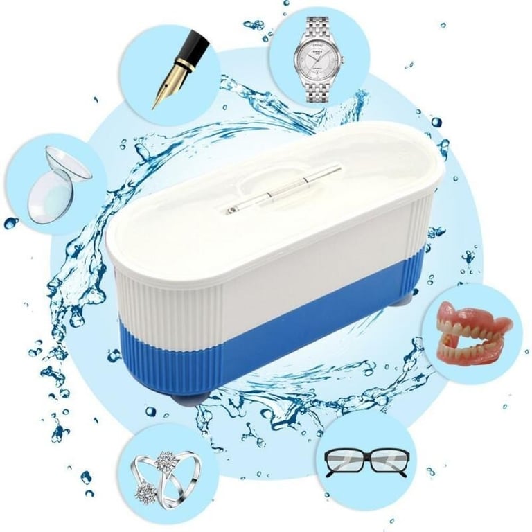 The ultrasonic cleaner is suitable for hygienic cleaning of jewellery, glasses, watches, rings, coins, dentures, and other small items. The power button starts a five-minute cleaning cycle.