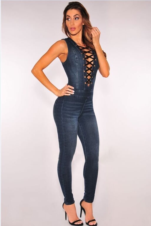 Unique elastic long women's jumpsuit with lacing.