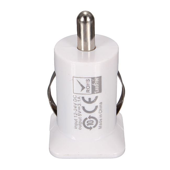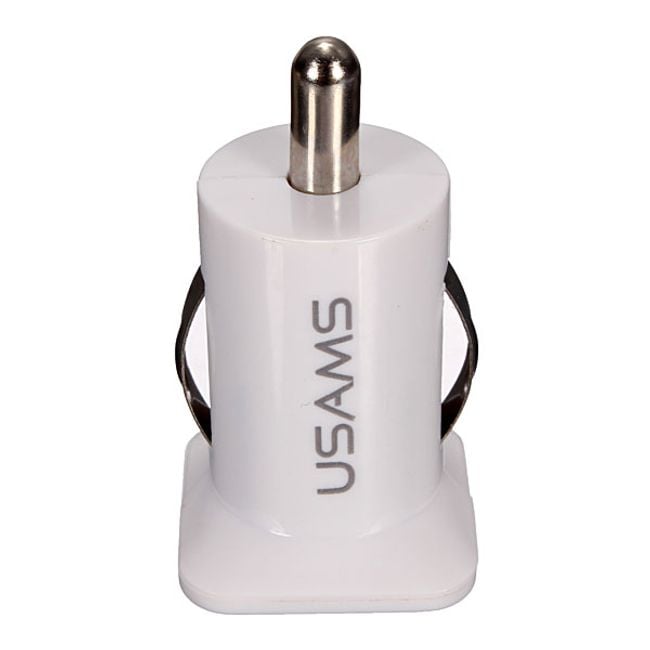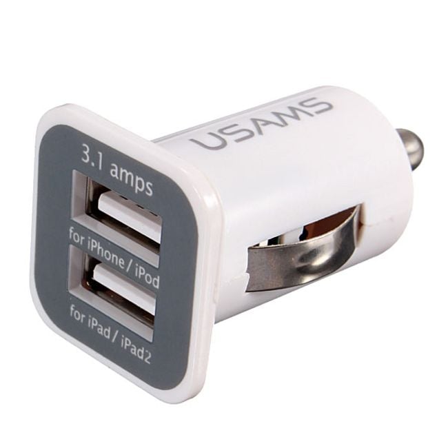 Universal USB car charger with 2 ports, suitable for most USB devices. Both ports can be used simultaneously. Available in white.