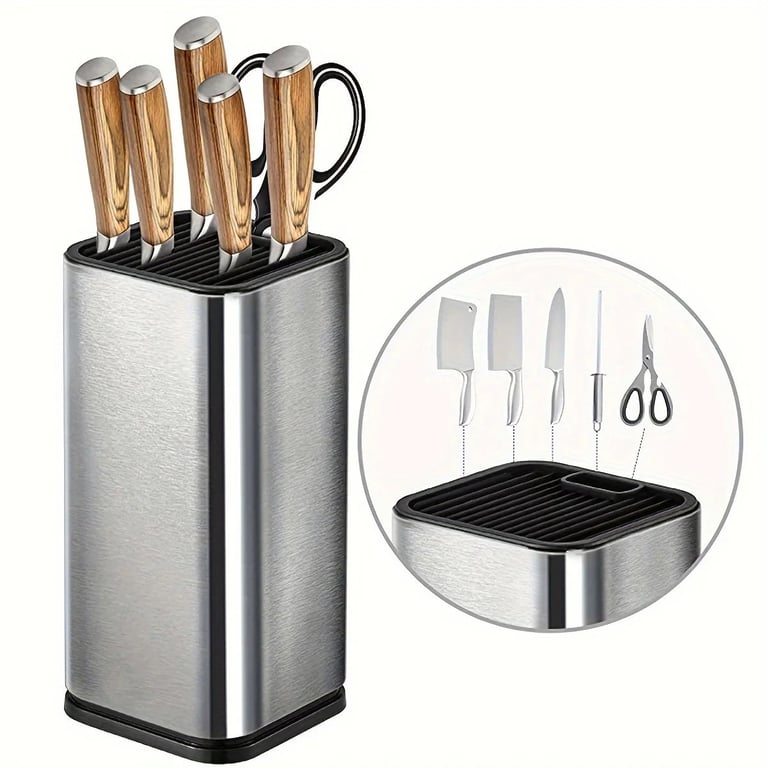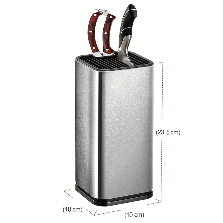 A stylish universal knife block made of stainless steel is a practical solution for every kitchen. Thanks to a special insert with plastic fibres, knives of various sizes can be safely placed into the stand – from small utility knives to large chef's knives.