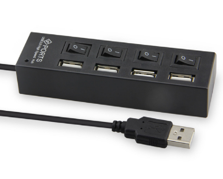 The hub features a stylish design with switches and LED lights for each port, allowing you to turn each device on and off individually.