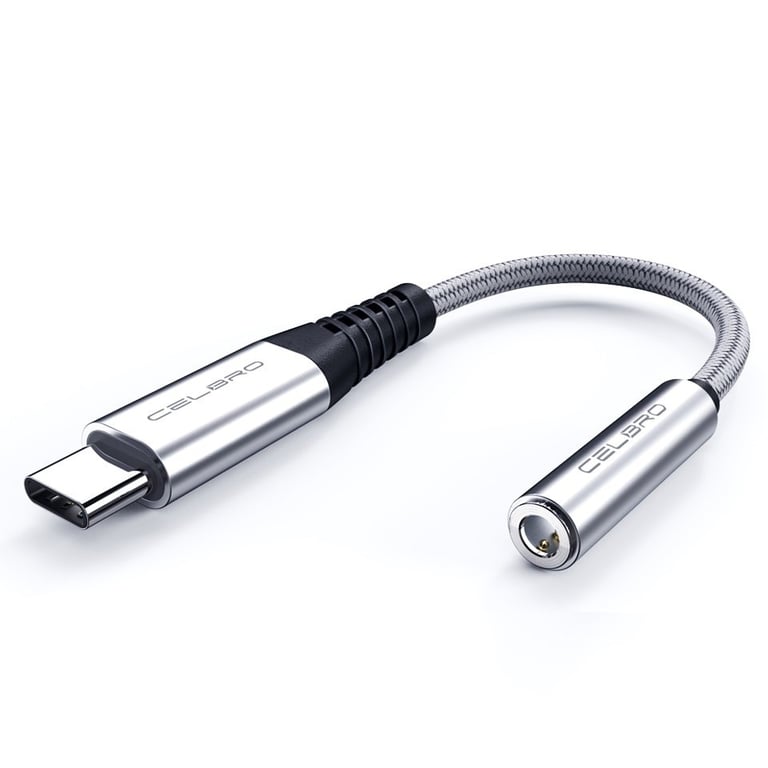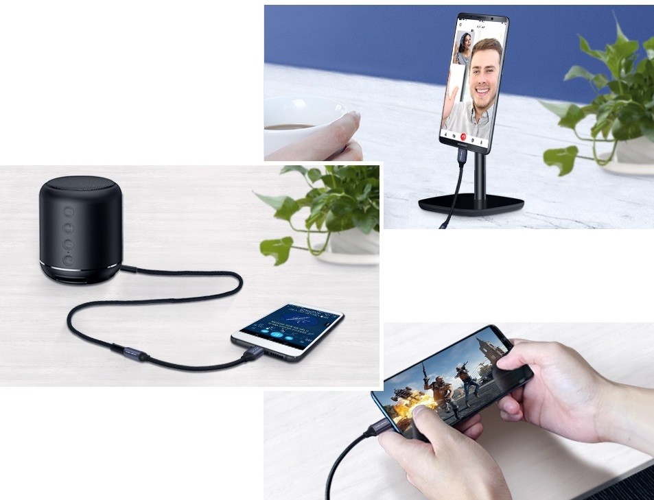 Allows you to connect a 3.5 mm jack AUX connector to a device with a USB-C input.