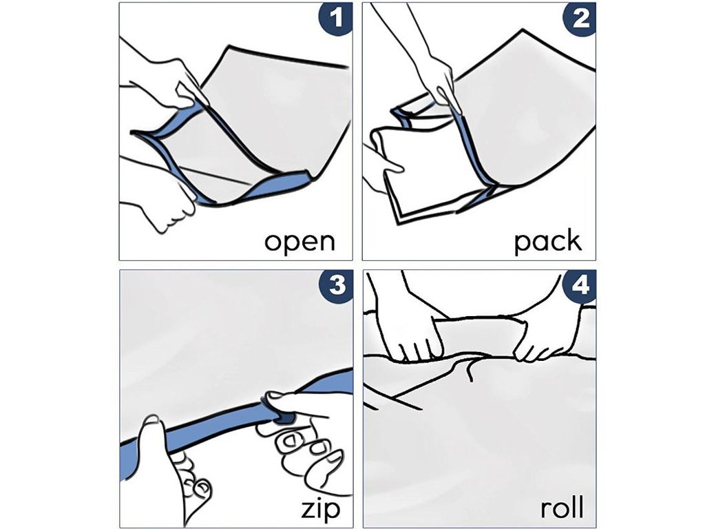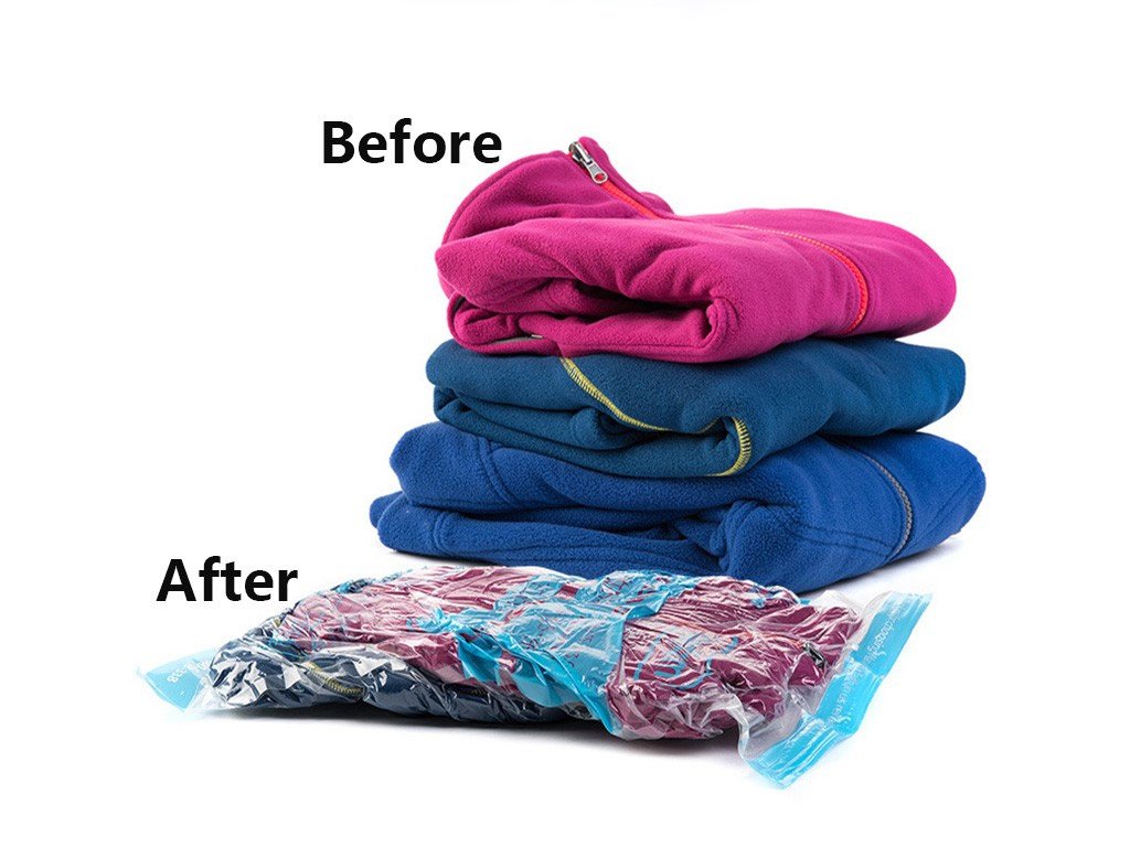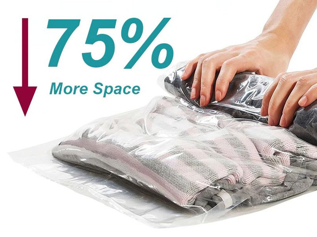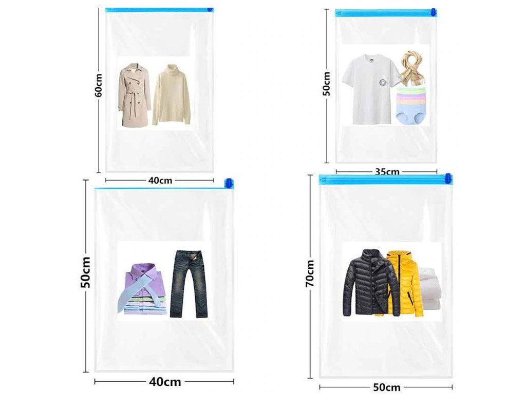 Self-vacuum bags are suitable for storing and packing laundry for travel when you need to save space in your suitcase. The bag is equipped with a special closure through which you can easily squeeze out the excess air in the bag.