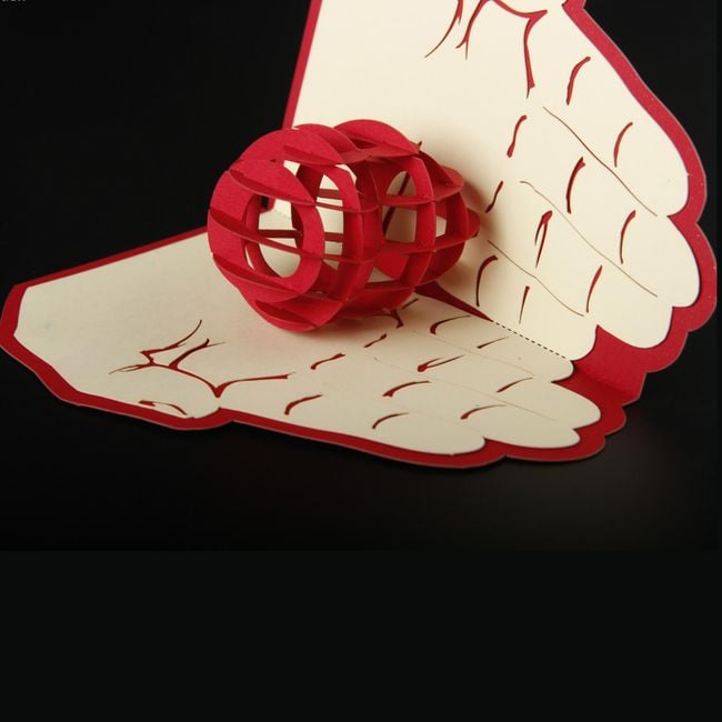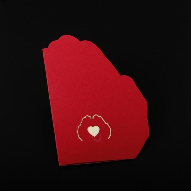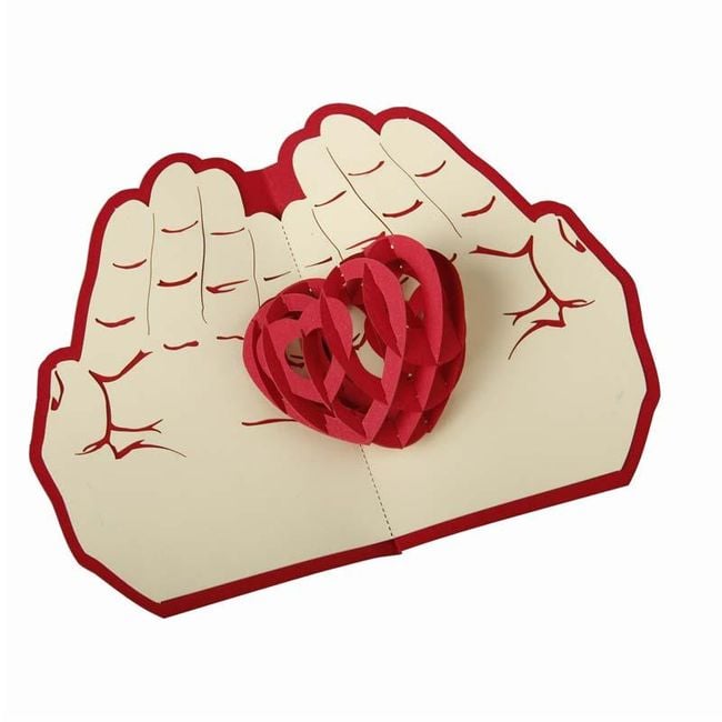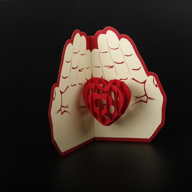 Valentine's paper 3D greeting card in the shape of hands with hearts.