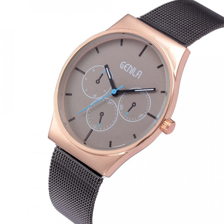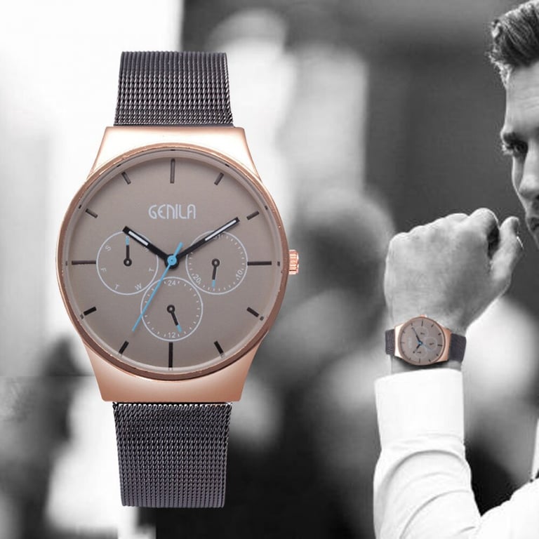 Elegant men's watch with an adjustable metal strap. Dial in a metal frame. Without numbering.