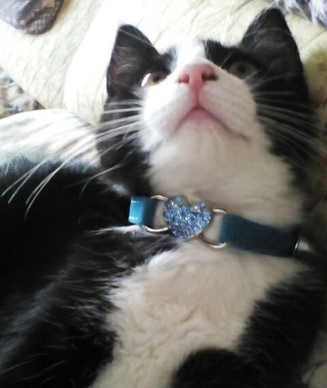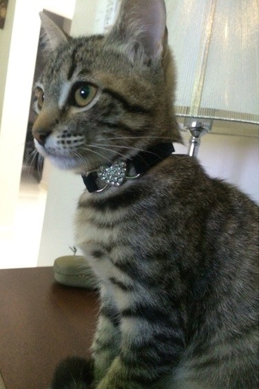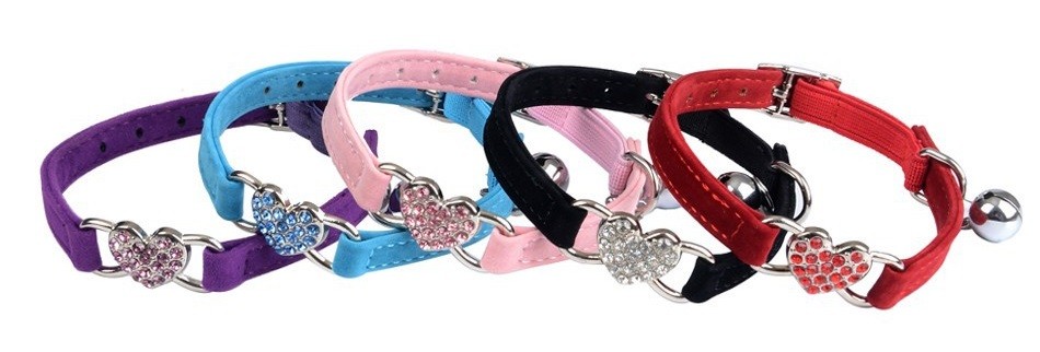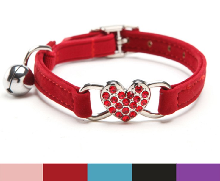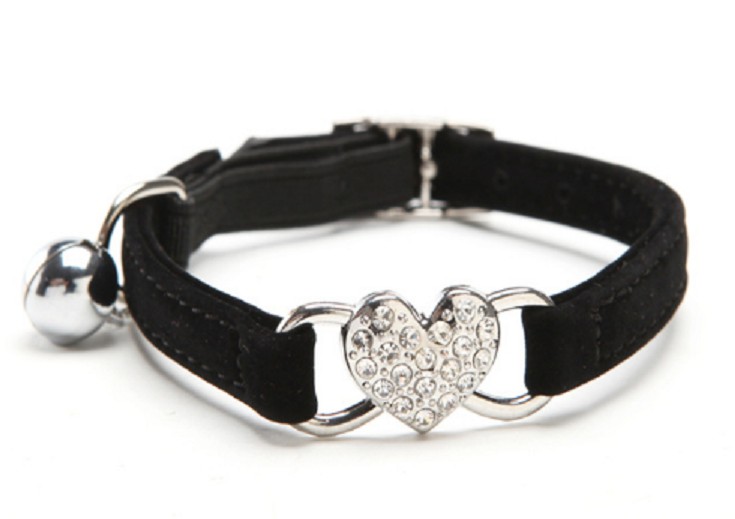 A cute collar for cats, adorned with a heart featuring diamonds and a small bell.
