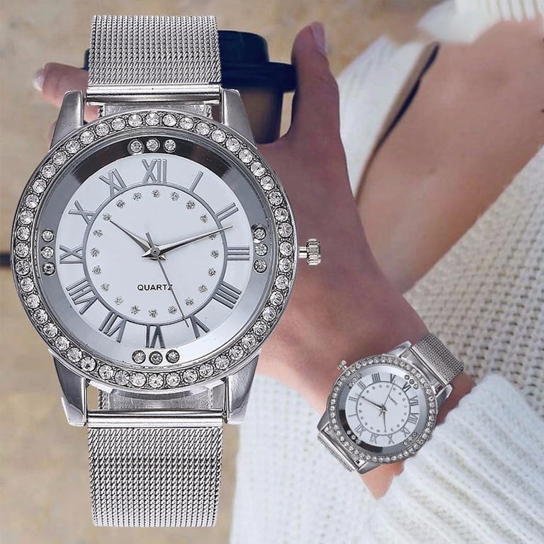 Luxury watch with glossy polished glass, a dial with Roman numerals, and a metal strap. Enhance your work and social appearance with this elegant piece.