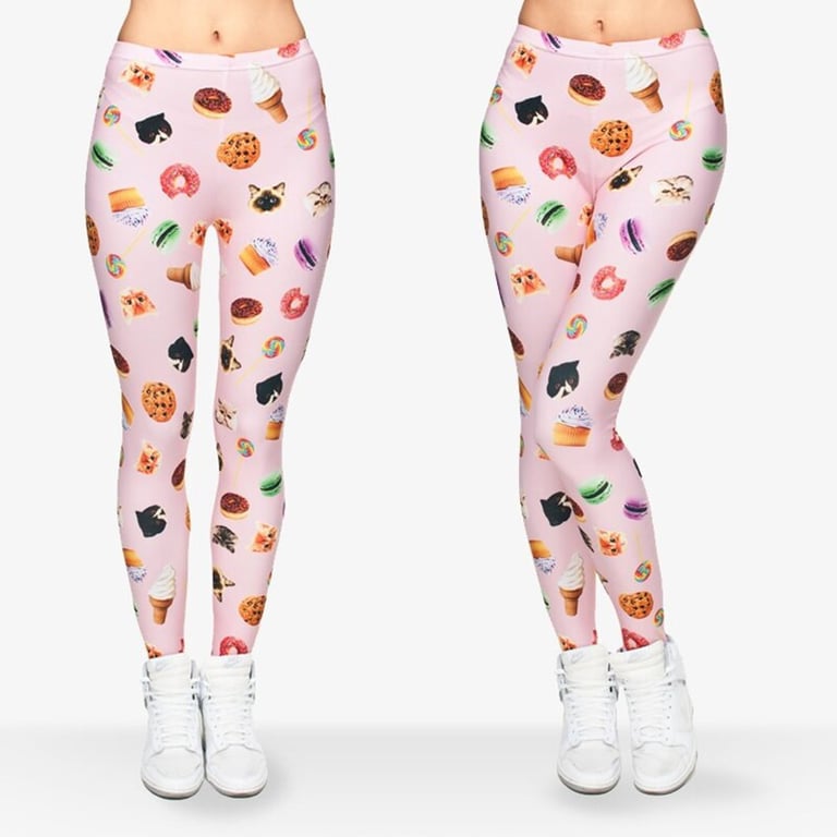 Women's leggings with a high elastic waistband. Long, slim-fitting legs. Colourful all-over print. Dessert motif.