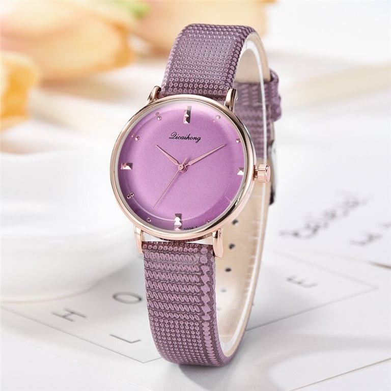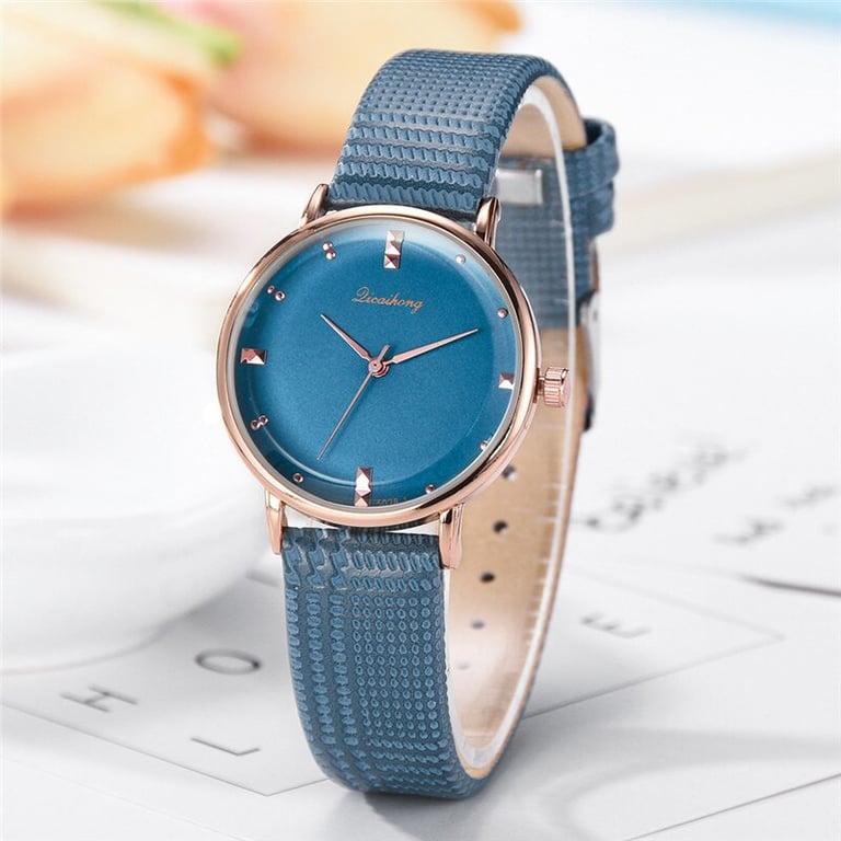 Women's wristwatch with an original leatherette strap. The dial is in gold with small stones. Available in multiple colour options.