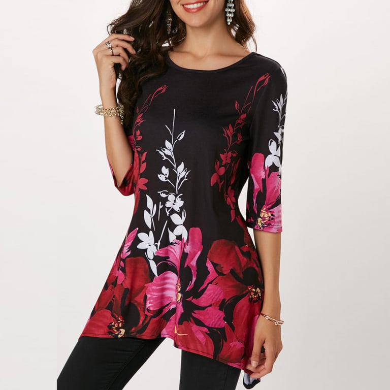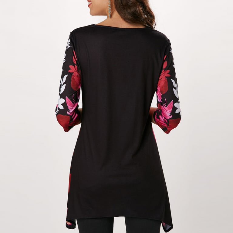 Women's blouse with a floral pattern and three-quarter sleeves.