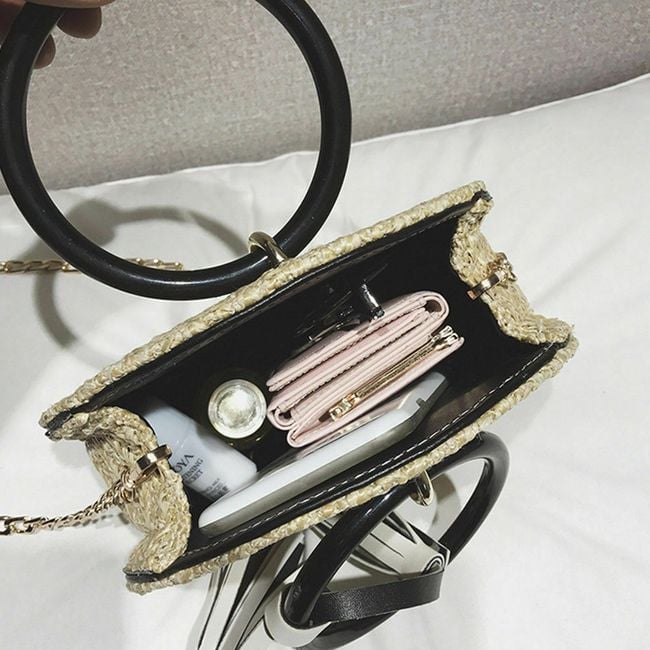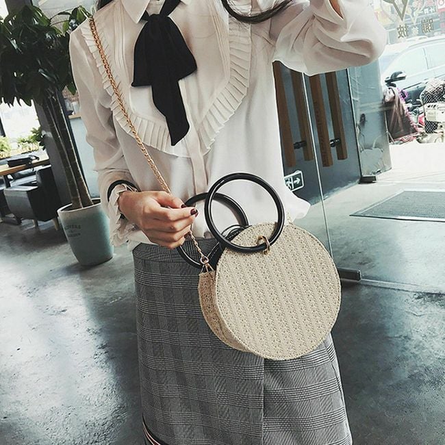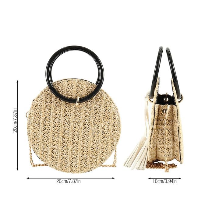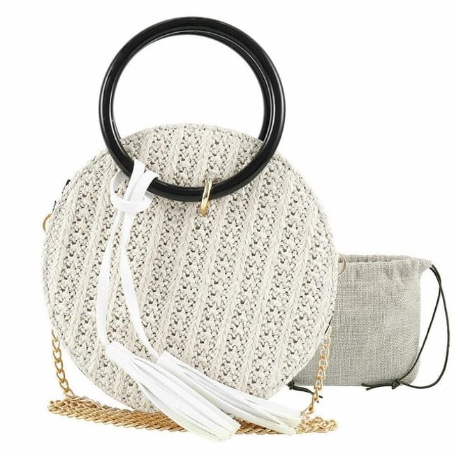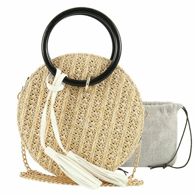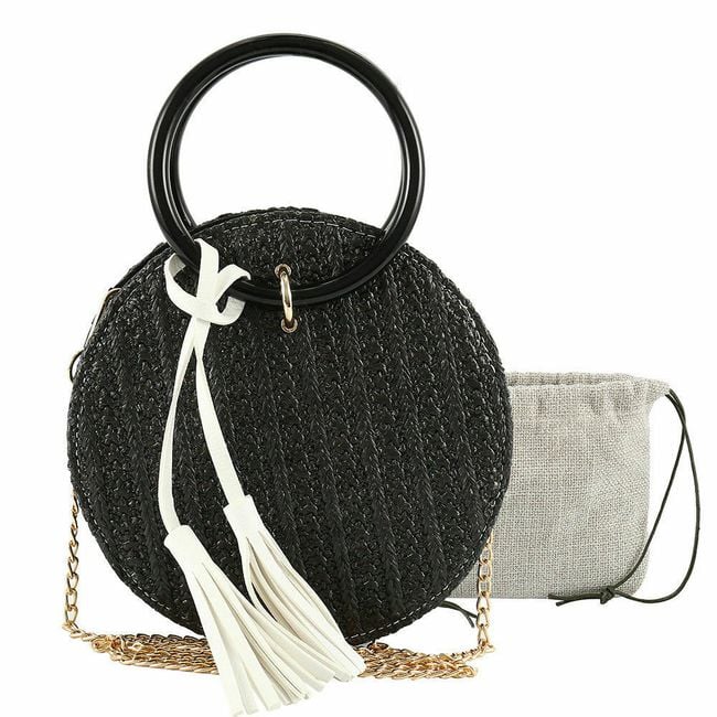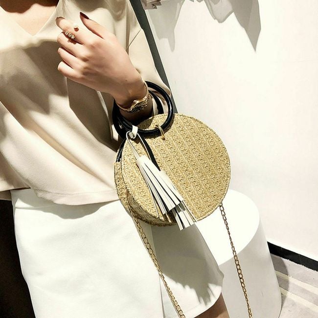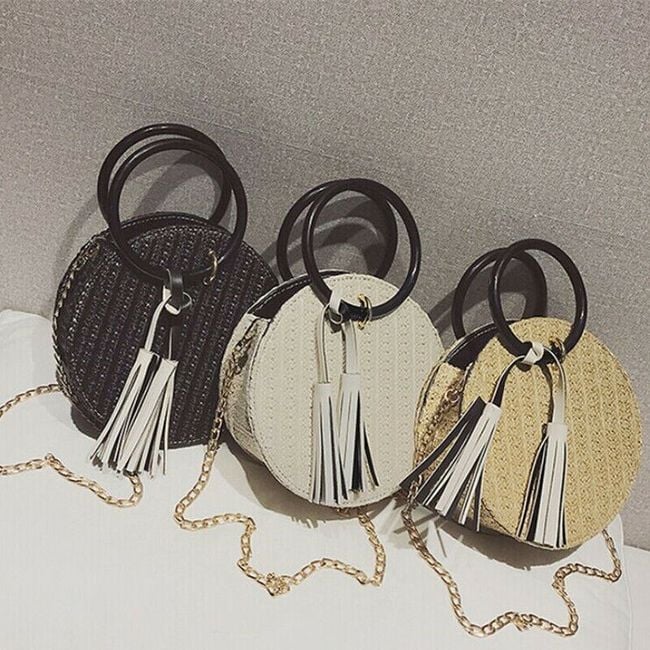 Luxury women's crossbody bag in a round shape, adorned with tassels and featuring a chain strap.