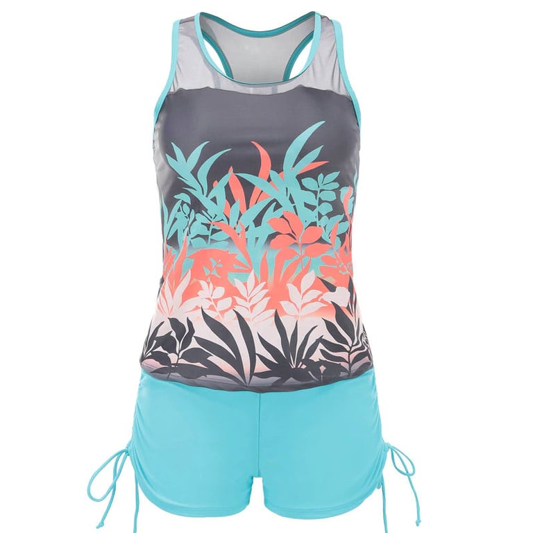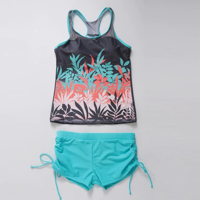 Two-piece tankini with an attractive print and classic cut.