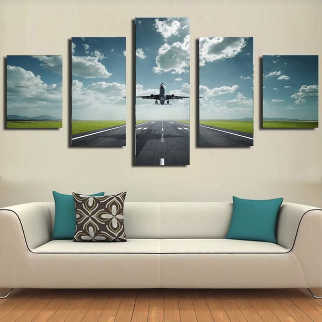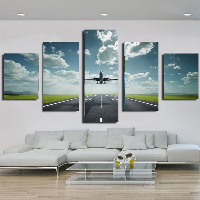 Wall canvas print depicting an airplane on a runway. The artwork consists of 5 pieces.